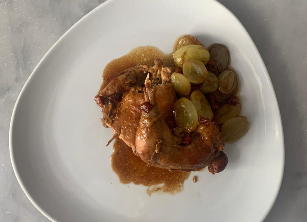 Then the bird is stuffed wiht sausage and with its own organs previously chopped, then sewn; it is roasted in butter, then stewed in wine, honey, vinegar. It is served with an onion jam… handmade by Susan while the pigeon is cooking.
