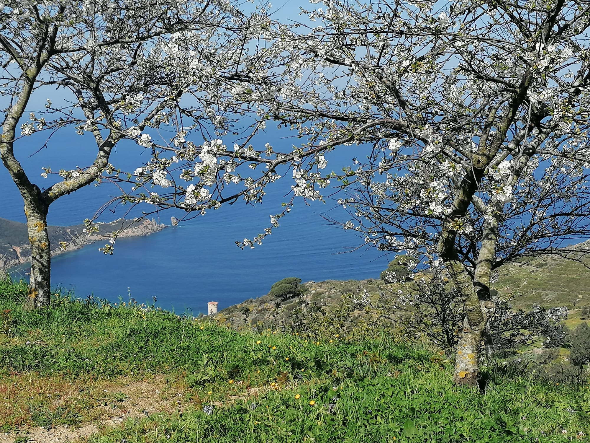 They were planted by Sandro along the road to the Castle. In this stretch the suggestion of the place increases, framing the Campese bay. They are sour cherry trees. I