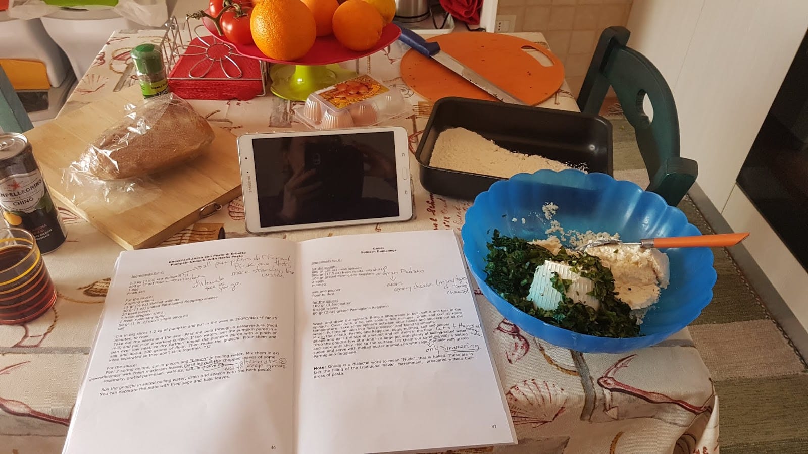 This is the kitchen table of Sarah Wheeldon, a Canadian actress who took a two week program recently.The recipe book open (with her notes ), the bowl with ricotta and