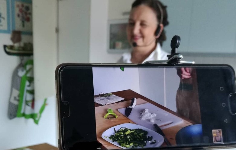 The whole family gathered in front of the sceen in the comfort of their home, to cook: BRUSCHETTA WITH TOMATOES GNOCCHI WITH MUSHROOMS RIBOLLITA THANK YOU JULIE! HAPPY BIRTHDAY! Marcella