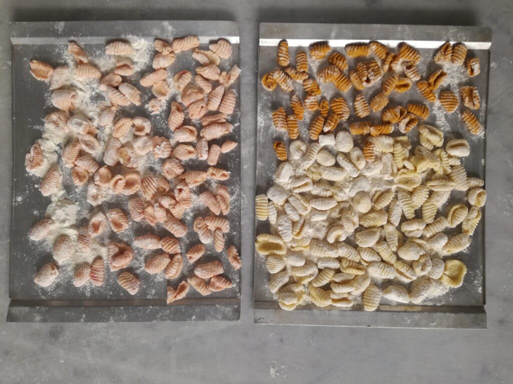 potato “chicche” in many colors: fuchsia, orange, green, brown