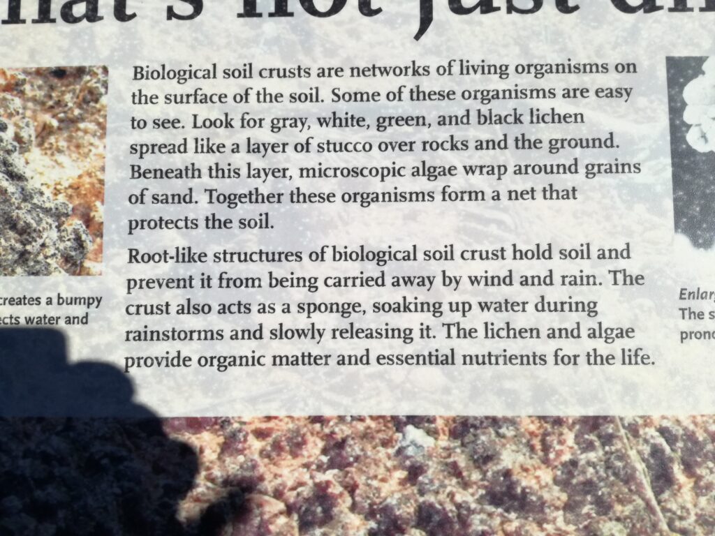 As a “native” she showed us and explained the great respect her ancestors had for Nature and its cycles. She showed us the cryptobiotic and explained its function. It is so important that, at least in national parks, the cryptobiotic patches have been fenced off in the hope that they will not be trampled. Because a single kick can cause its destruction.
