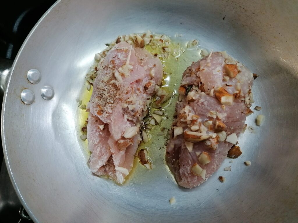 Season each slice of chicken with salt and pepper. Scrape 8 sprigs of marjoram and distribute the leaves on them. Sprinkle ½ tbs of bread crumbs and ¼ tbs of chopped almonds on them. Distribute also the grated zest.
