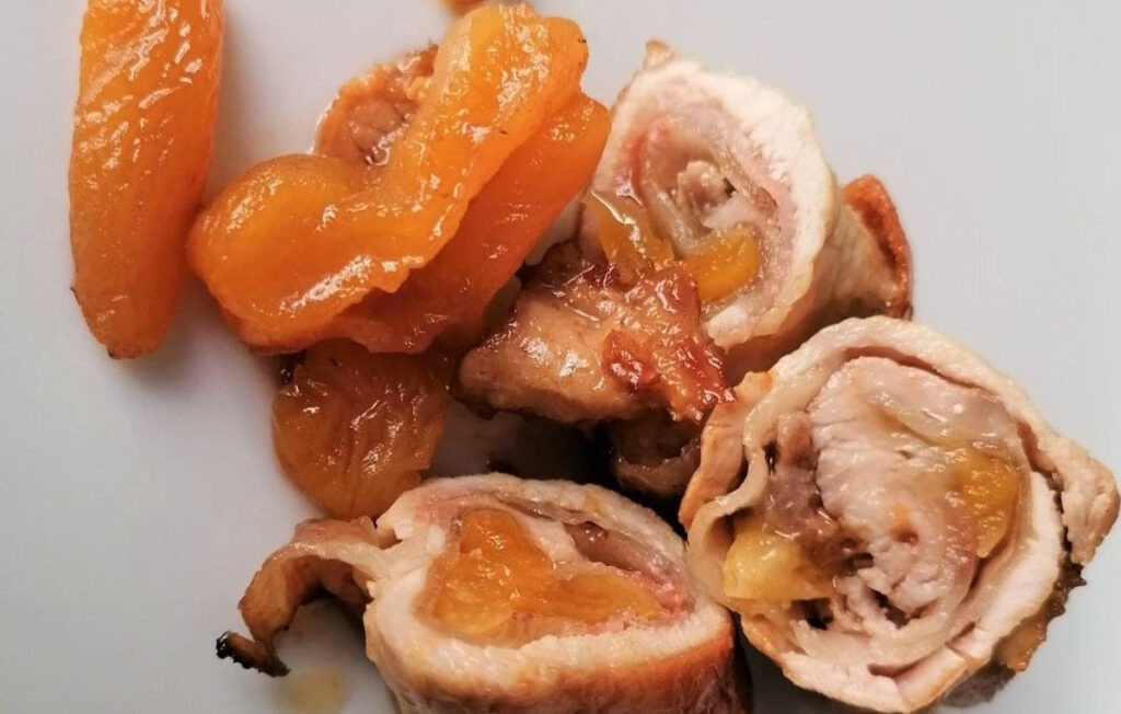 | Ingredients for 4: 8 thin slices of pork loin 100 gr (3 oz) dry apricots (or 200 gr of fresh apricots) 100 gr (3 oz) pancetta 30 gr (1 oz) extra virgin olive oil a splash of Brandy salt and pepper |