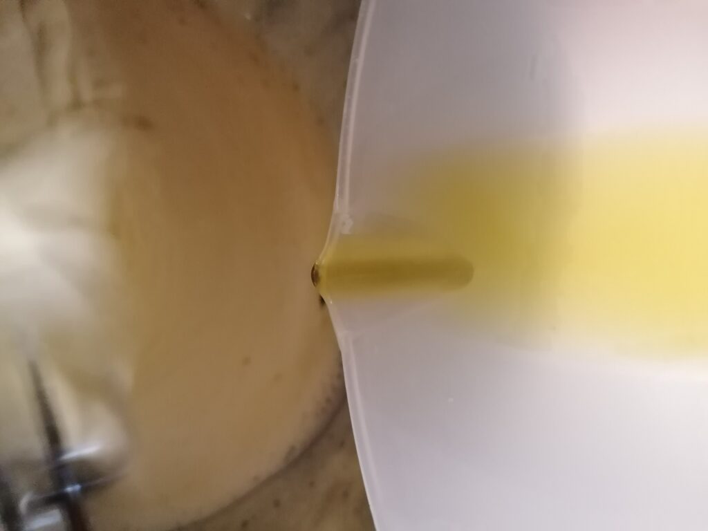 While beating, pour the extra virgin olive oil, gradually and constantly.