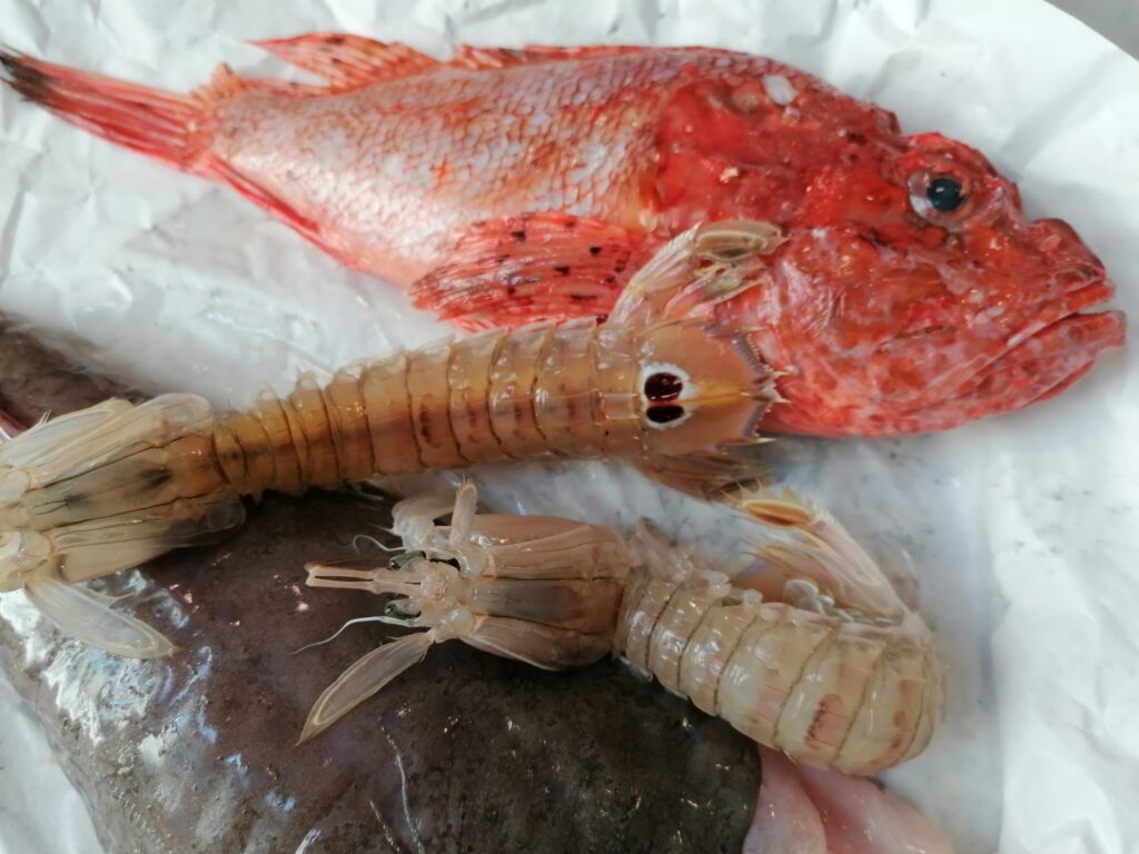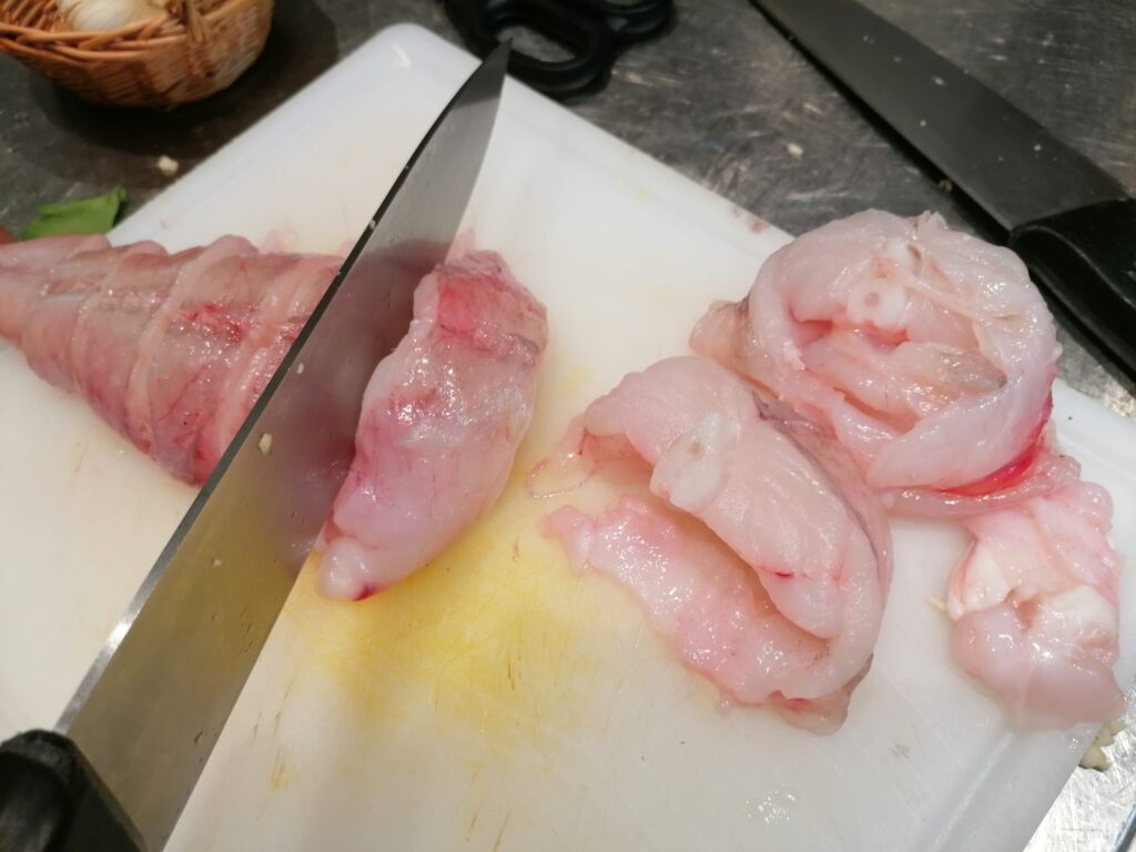 You start by cleaning the various fish. Today we had monkfish, which has been skinned, and a beautiful red scorpionfish. We also had an octopus, some king prawns, some corn on the cob, mussels and clams.