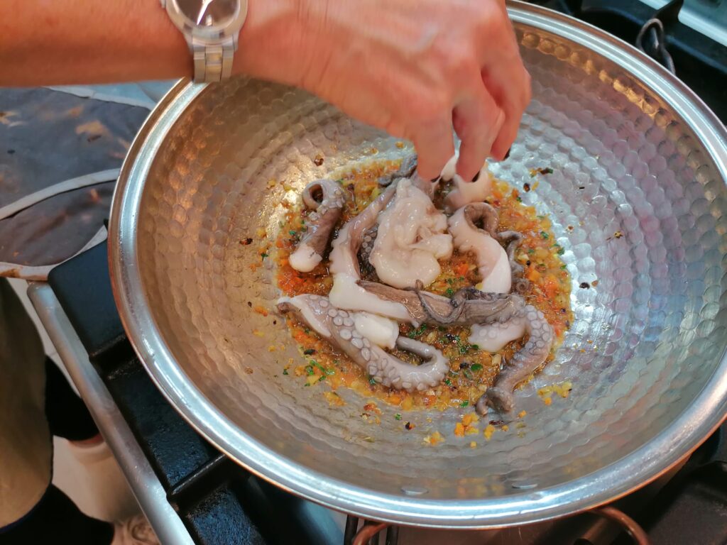 Clean all the fish, keeping aside the larger heads, which can optionally be used to make a broth. Remove the shell from the prawns. Clean the octopuses well..