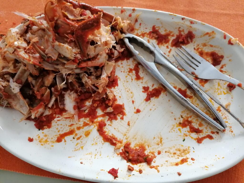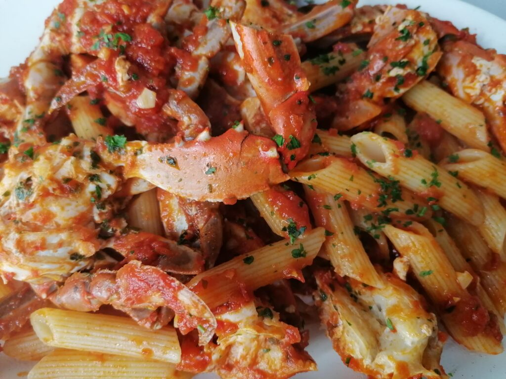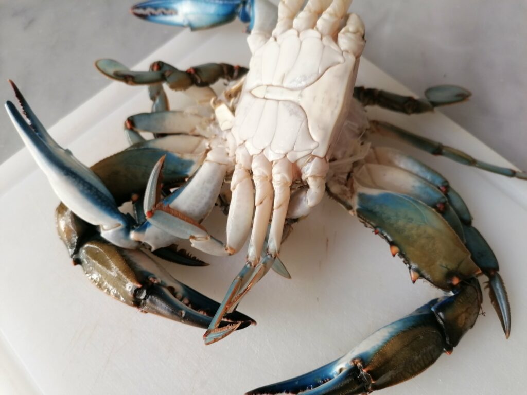 My father would have used”spernocchie” (spernocchie – mantis shrimp -: they have a thousand names. What do you call them?) or scampi or a large spider crab, which in my area is called “margherita”. All shellfish with a much stronger flavor than the blue crab, but if we have to save the planet from crabs…