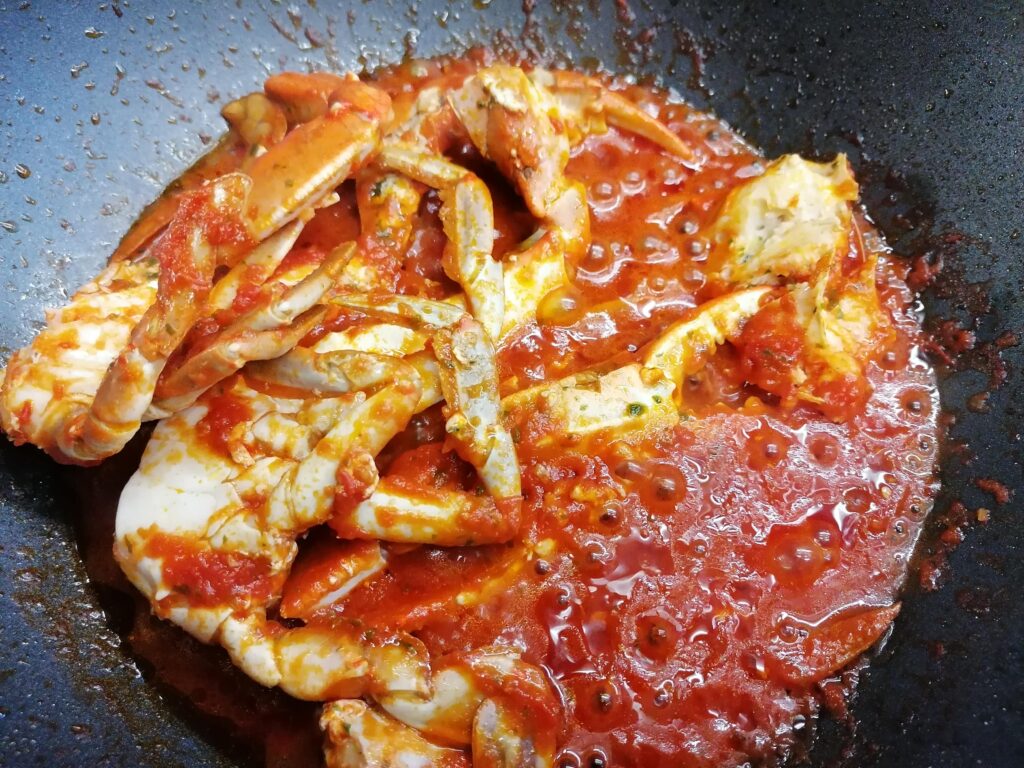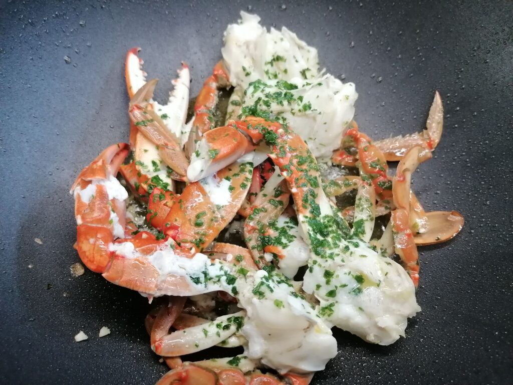 I had two medium-small crabs, so it wasn’t worth opening it and digging through the cartilage to collect the little pulp. I then cut them into pieces, taking care to break the claws and larger legs to facilitate the extraction of the meat once cooked.