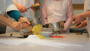 Il cibo, il calore della stufa si mescola con il calore umano. Soprattutto quando le mani iniziano a intrecciarsi lavorando insieme.