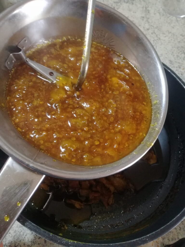The inside pulp must be weighed. I had about one kilo ( 2,2 Lb) . Let’s calculate one quarter of it with sugar ( for me 250 gr , that is 8 oz) . Cut the inside pulp in big chunks and cook it with the sugar. Don’t bring to the end of cooking: as the sugar is melted and the consistency still liquid, pass it throught the food mill to eliminate the seeds.