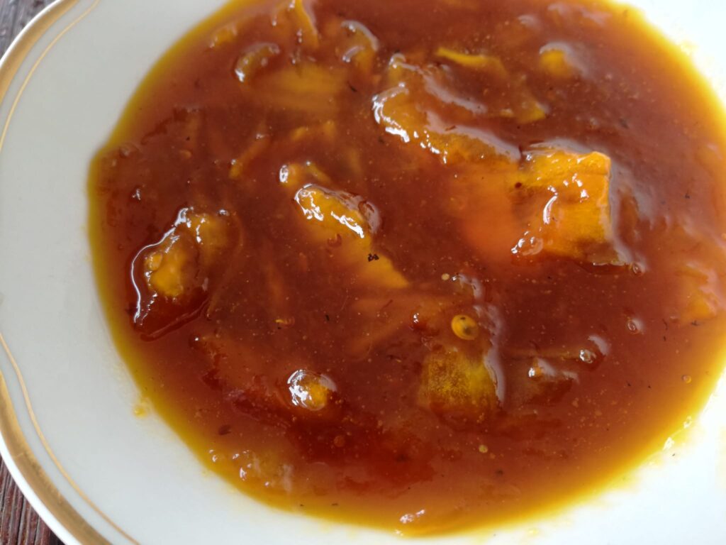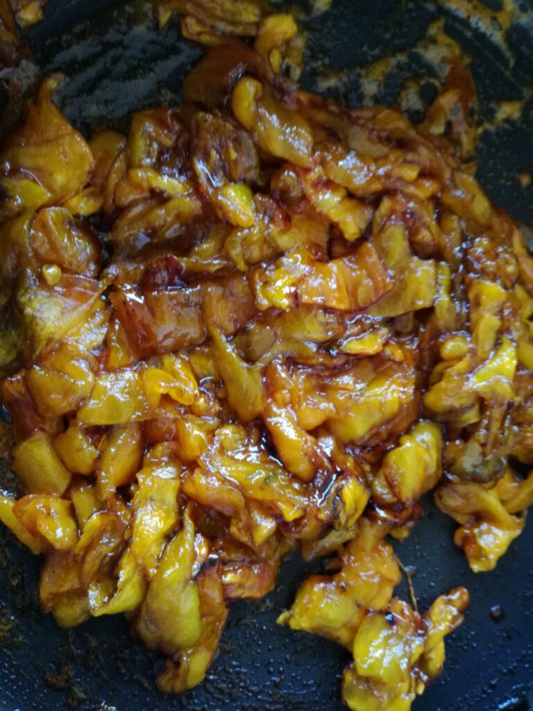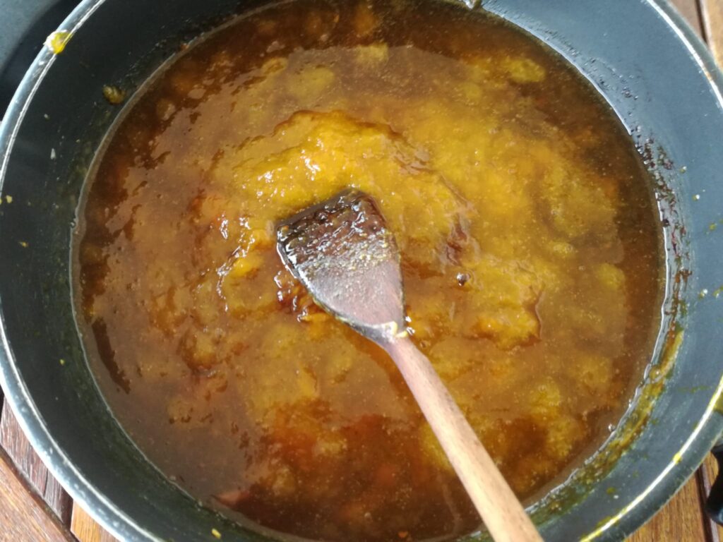Meanwhile, also the outside pulp must be cooked, with the same percentage of sugar. I had about 250 gr – 8 oz -, so 80 gr of sugar – 2 1/2 oz