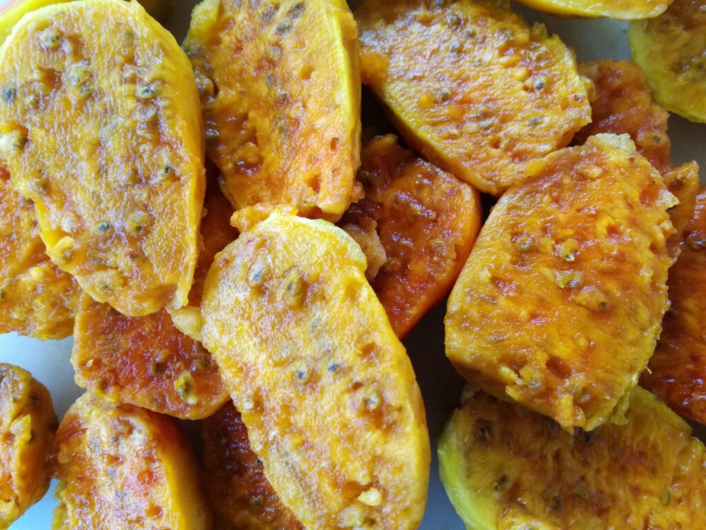 You will notice, cutting them, that inside the pulp is soft, gelatinous and full of seeds. This inner “heart” is coated with another layer of pulp..