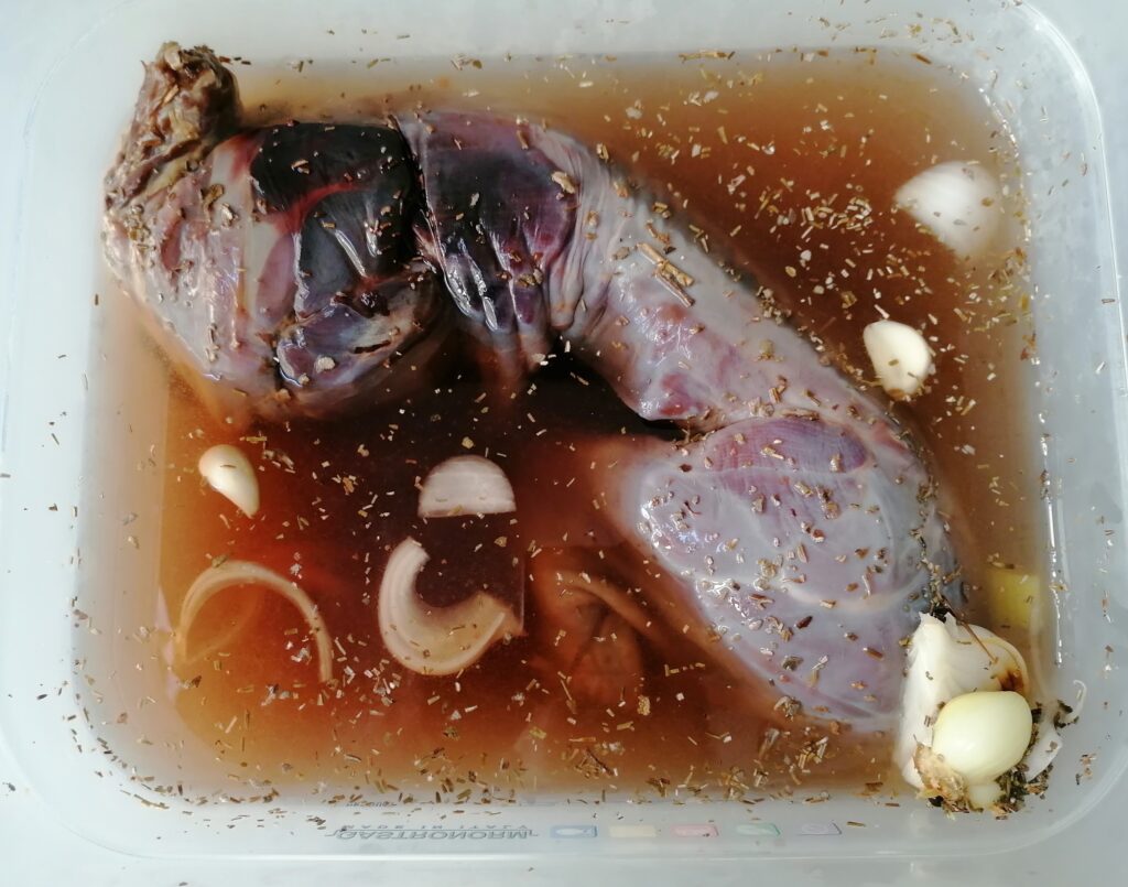 Lots of white wine in which to marinate the rabbit or the hare. together with vegetables and aromas: carrot, onion, garlic, celery, juniper berries, rosemary and sage. It should be kept overnight in the fridge in the marinade.