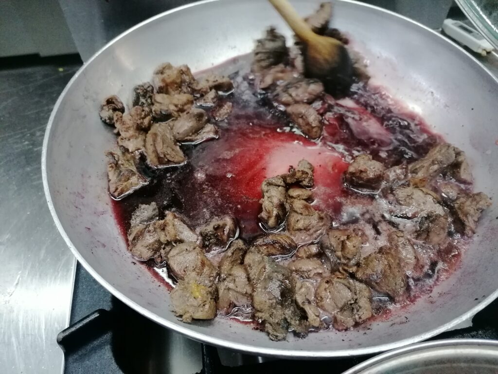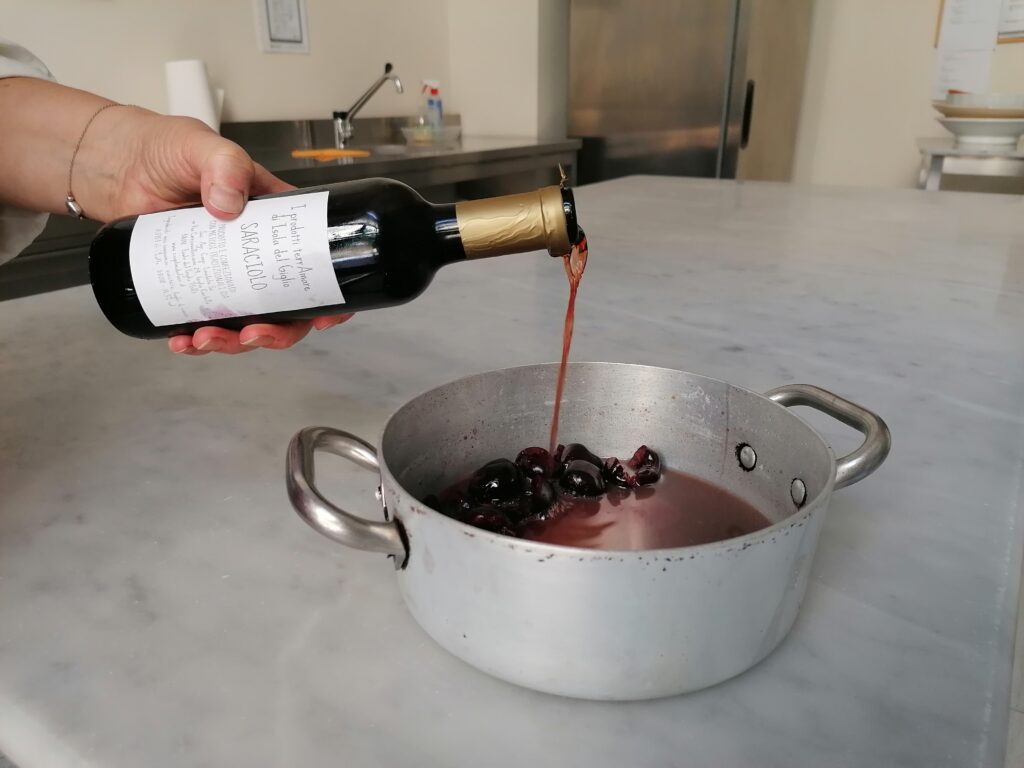 The flavored salt and cherries – or pitted sour cherries – a glass of Saraciolo wine are added to the filtered base. Cook for about 5 minutes, stirring often, until the sugar contained in the ingredients creates a glaze,