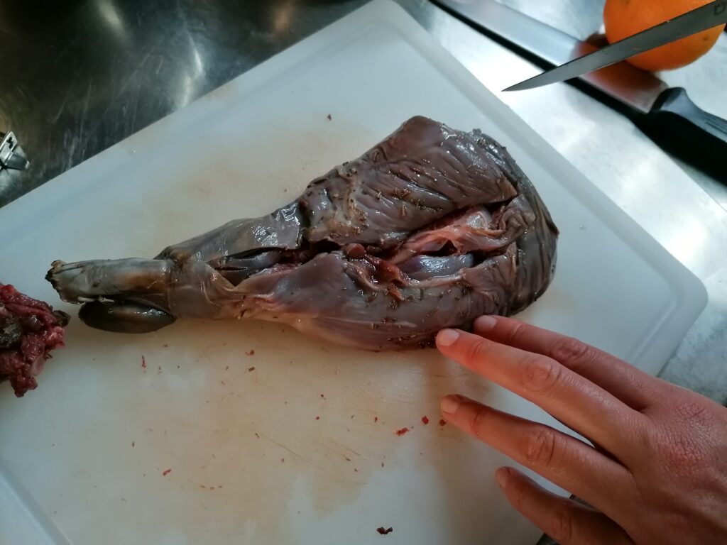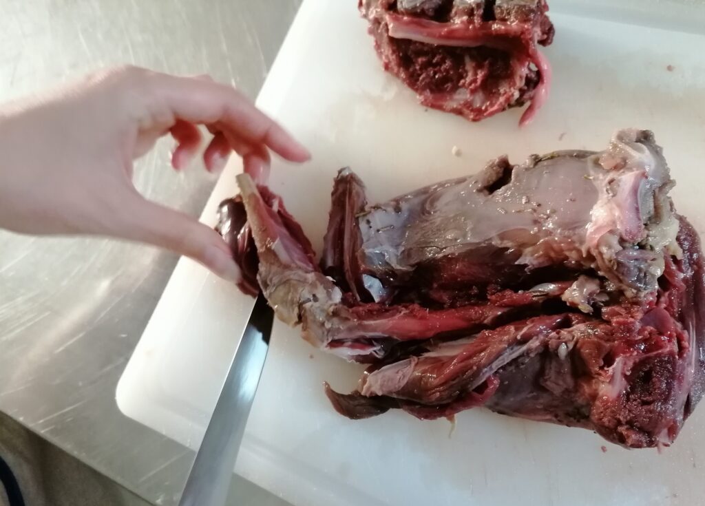 The next day you have to dry it and start cutting it. I follow the joints of the hips and forelegs. The wine from the marinade is thrown away: it has done its job now and some of the “wild” flavor is left in there. Our hare – or our rabbit – will have the sweetness of the wild but will not be too strong.