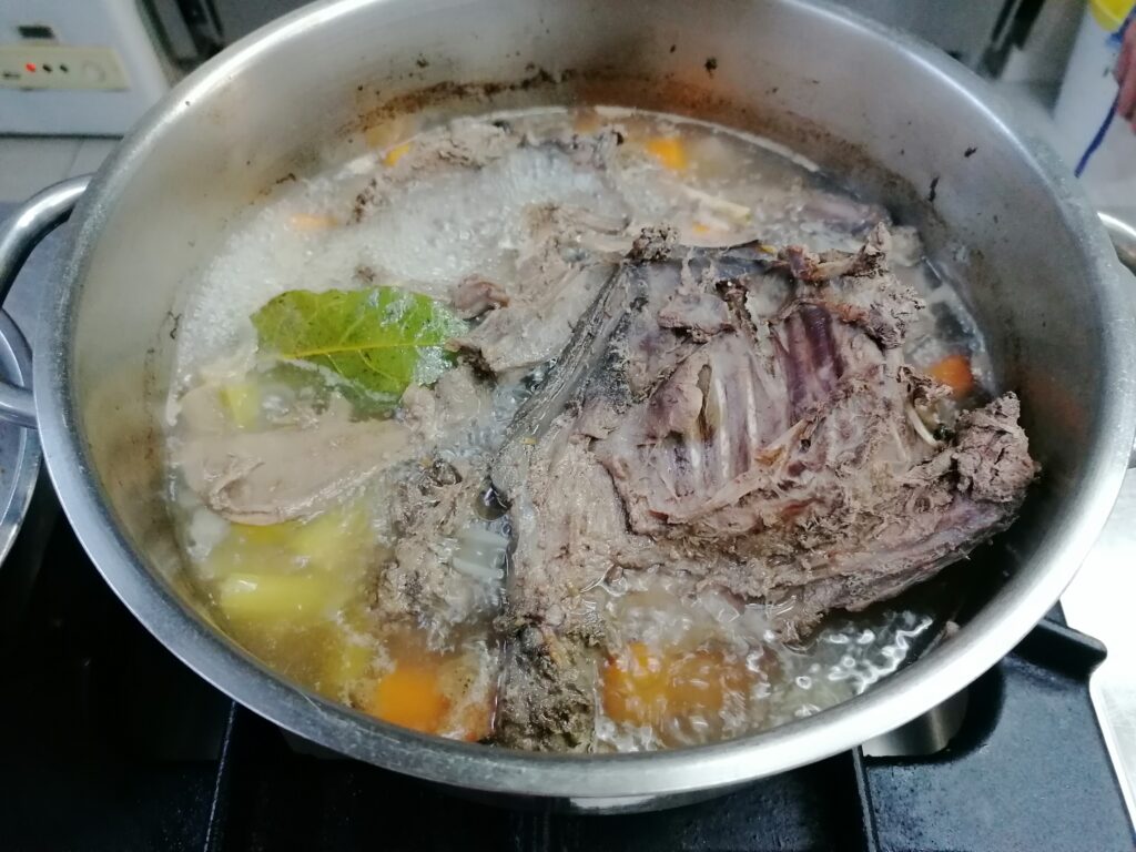 With the bones we make a “fast fundation” . All in a pot, together with a carrot, an onion, a stalk of celery, cut into pieces; two cloves of garlic; one leaf of then and two of sage. Double the weight in the water and off on the high heat for about 40 minutes, until we get one centimeter (in height) of rather dark reduction.