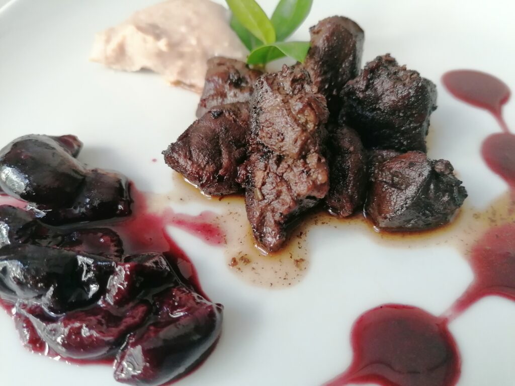 Hare meat, cherry sauce, chestnut quenelle, a fresh myrtle leaf. Try it!
