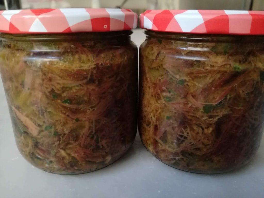 – Ultima operazione: pressare la “carne secca” nei vasetti di vetro, condire con erbe di montagna e ricoprire con buon olio extra vergine di oliva. Naturalmente del Garda.
