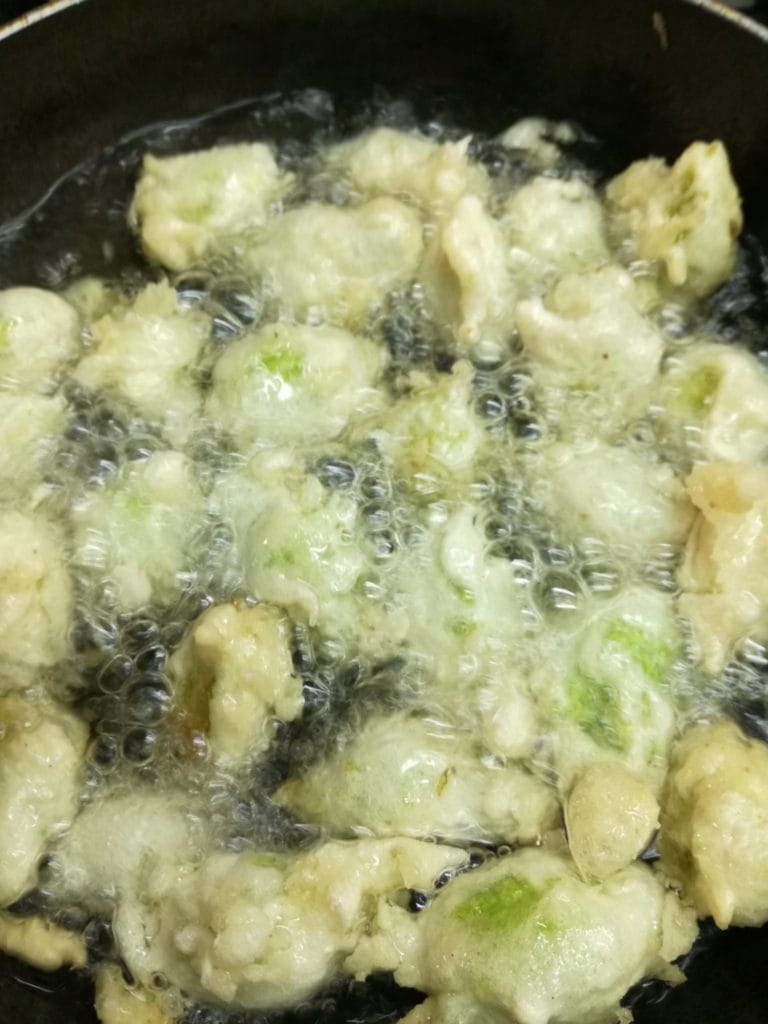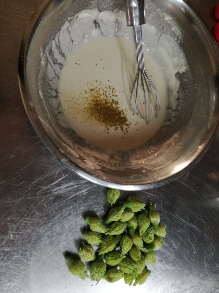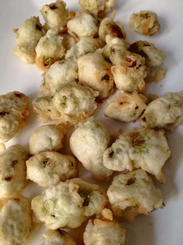 Si prepara una pastella abbastanza liquida, con lo stesso peso di farina e acqua. io ci ho messo anche dei fiori di finocchio. Ci ho tuffato i boccioli e li ho fritti finché sono diventati leggermente dorati. Piacevoli quando sono caldi, spolverati con un po’ di sale.