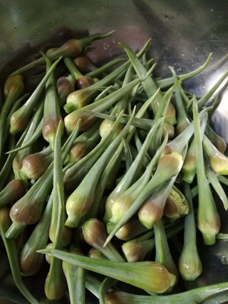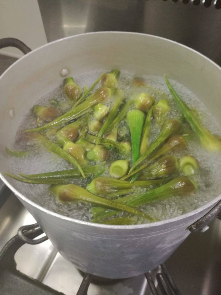 Tanto semplice quanto al tempo stesso un po’ laboriosa. Non fosse altro per il fatto che i ceci vanno tenuti a bagno almeno un giorno ( magari cambiando l’acqua una volta), scolati ( abbiamo già una ciotola e un colino da lavare ) , messi in una pentola, ricoperti di acqua e messi a cuocere. Poi, in molti casi ( sempre dipende da come voi fate la vostra minestra) ci vuole un’altra pentola dove cominciare la minestra vera e propria. È il mio caso. Addirittura oggi di pentola ne ho una in più dove ho messo a stufare piano piano i germogli di aglione affettati sottilmente. C’è un motivo per cui faccio così, e tra un attimo ve lo dico.