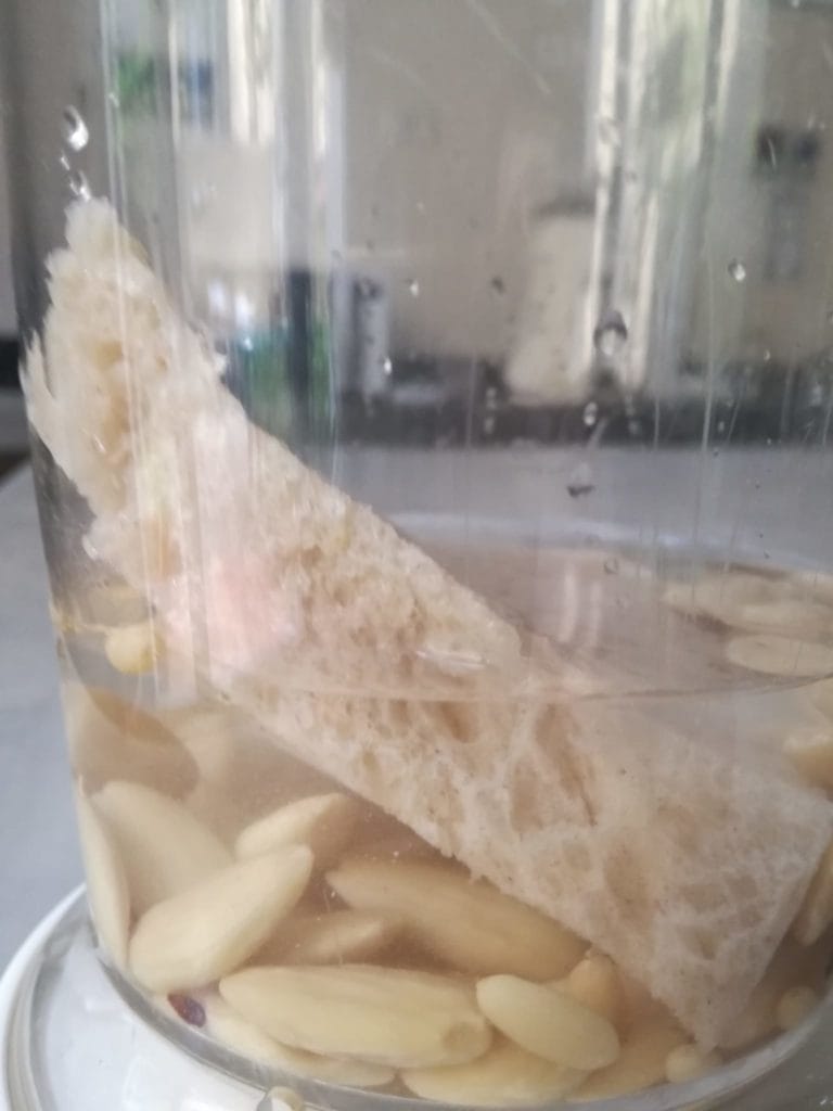 Aggiungere il pane ammollato e l’ acqua e procedere alla purea fine, raschiando di tanto in tanto i lati della ciotola. Coprire e conservare in frigorifero fino a quando necessario. Le noci gonfieranno e la mistura diventerà cremosa.*) Nota