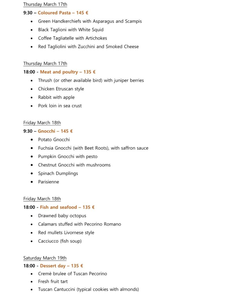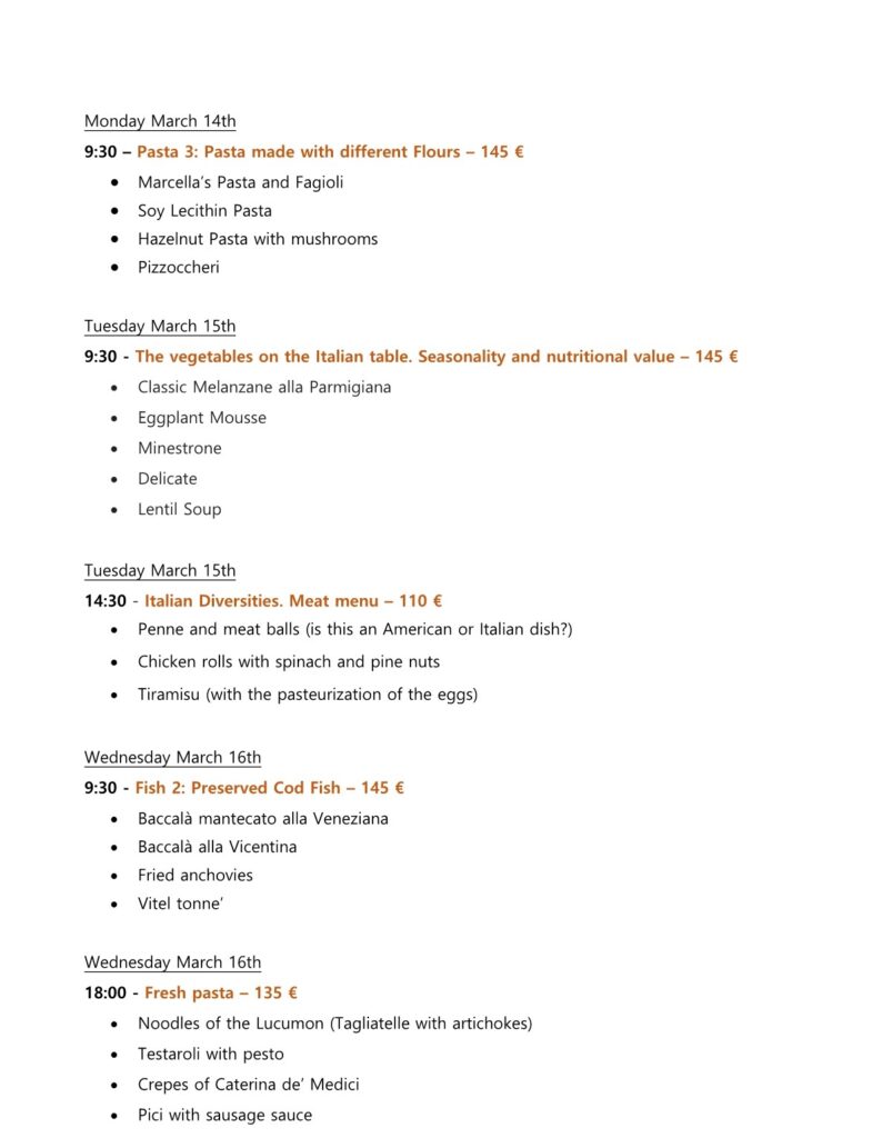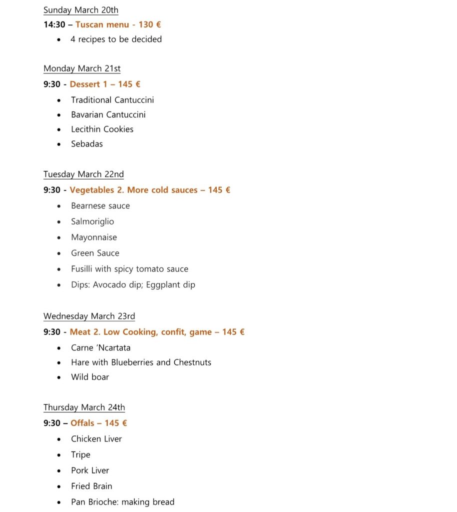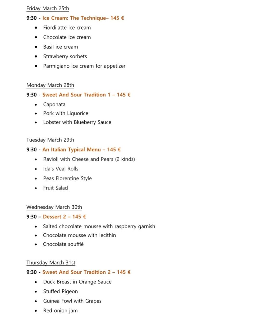 The lesson is completely hands-on and the Chef will guide you in the preparation of the dishes.
