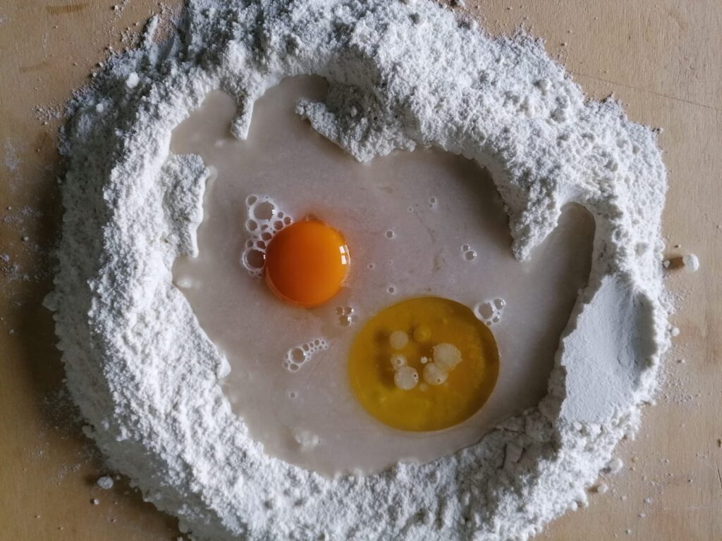 Melt the yeast in the water. Make a well with the flour and put all the ingredients in the centre. Start to beat with the fork, adding a little flour at a time. Then knead by hand until you get a compact, smooth and elastic dough. If it is too sticky, add some more flour; if it is too dry, add a little water. Let it rest, covered with a towel or under an upside down bowl.