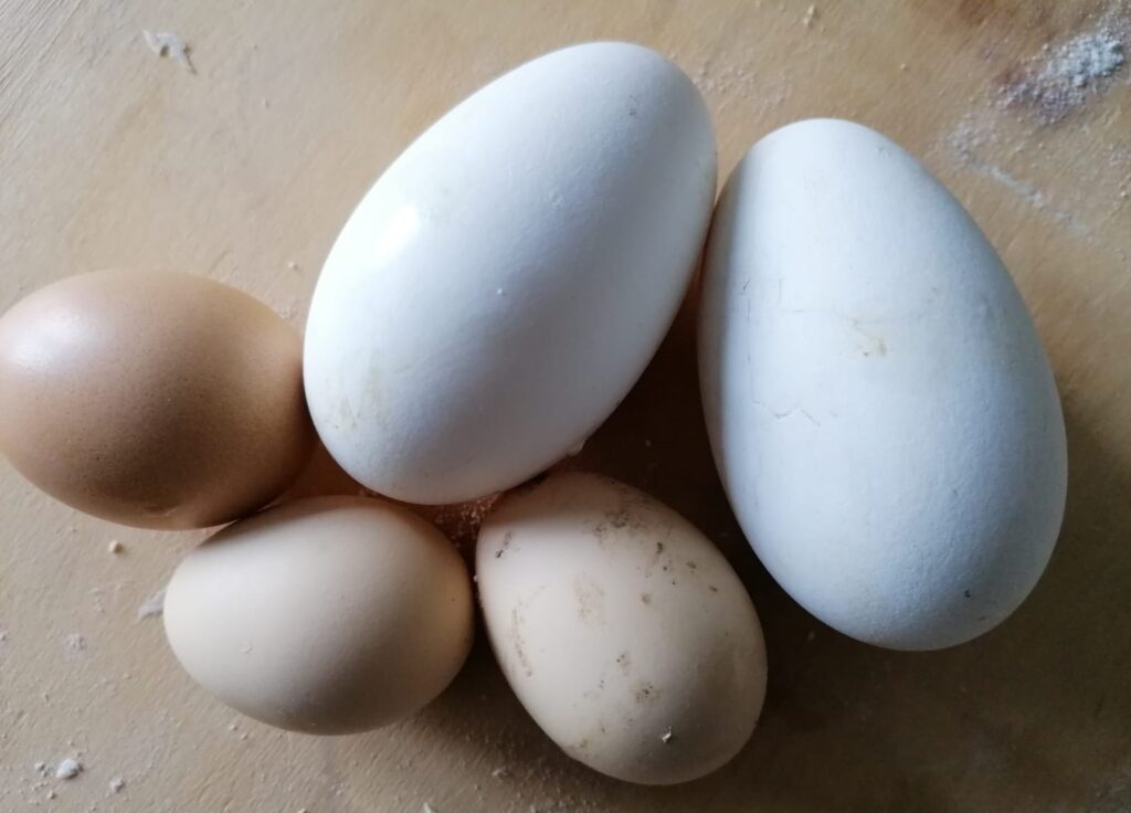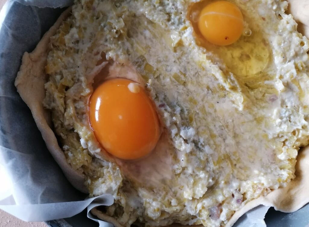 The eggs are the symbol of Easter. Once the stuffing is inside the pastry, make some concavities with the back of the spoon and place raw eggs in them. Here you see the difference of the size between hen and goose.