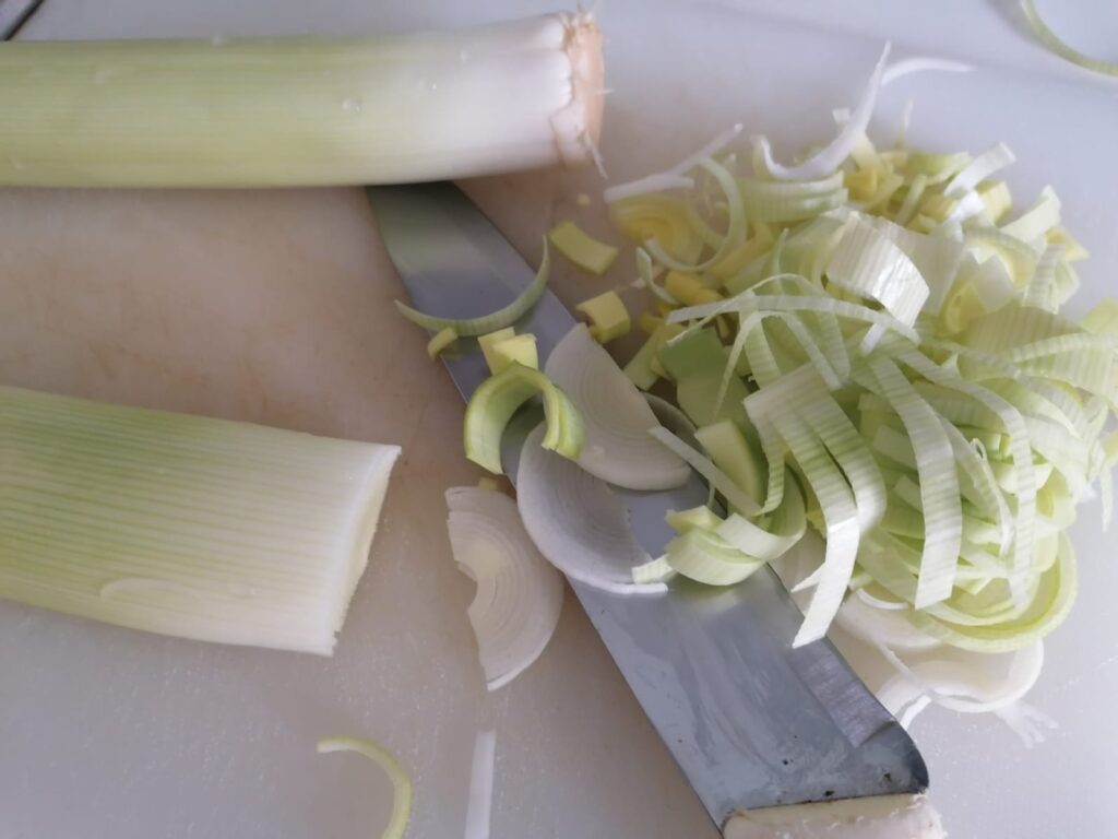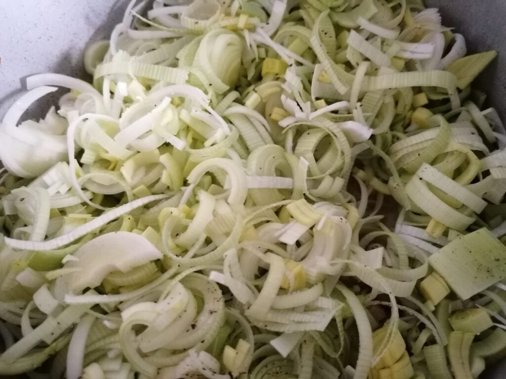 Cook the leeks on a very low heat, with the lid on. Stir occasionally and add a litter water so that they cook gently without frying. Cook until you get the result in the photo above.