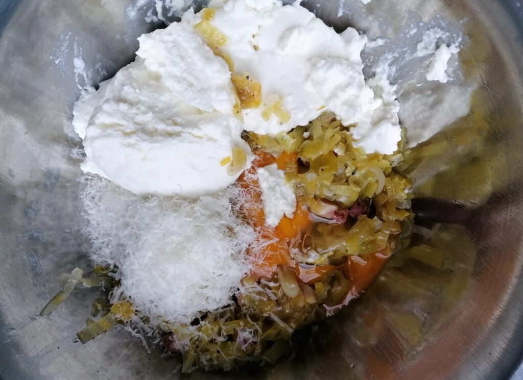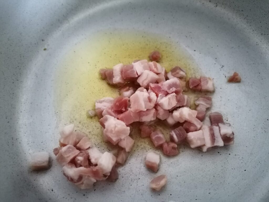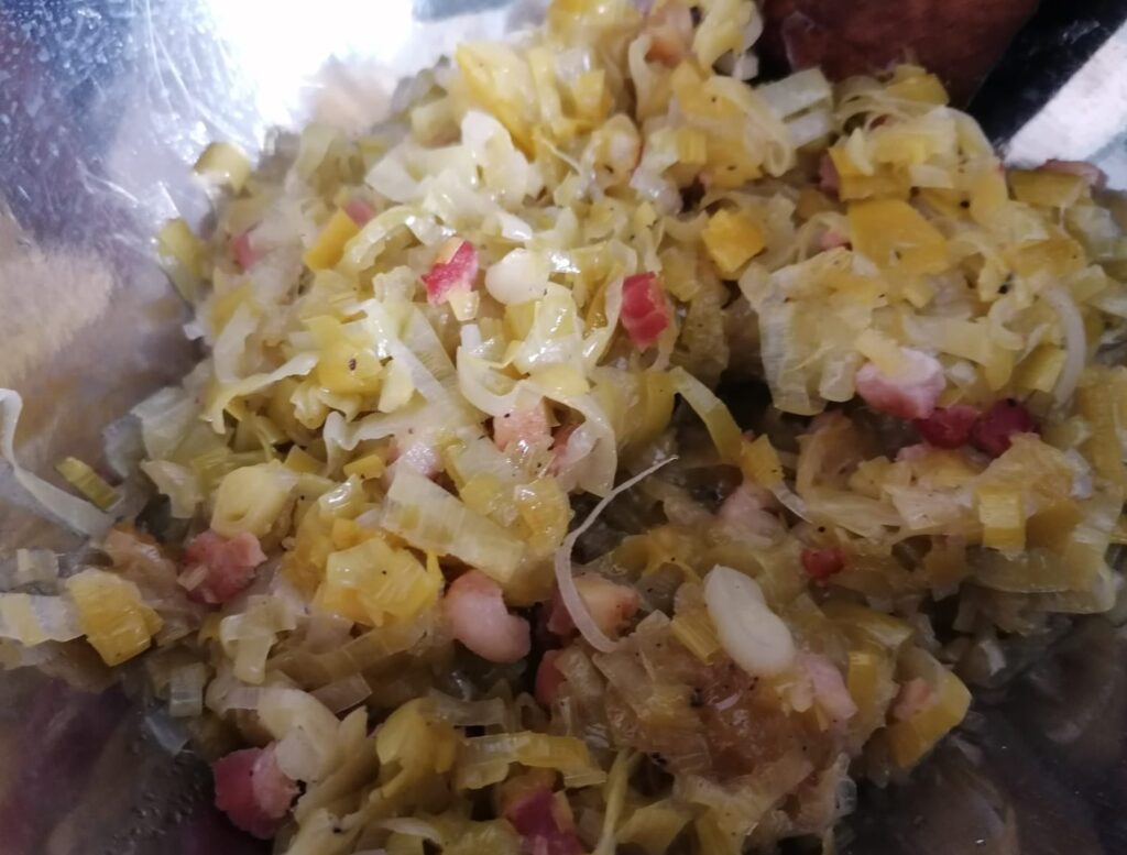 Scald the spoon of extra virgin olive oil in a pan with the bacon. Let it cook slowly until cooked ( not totally crispy). Add the leeks, salt and pepper.