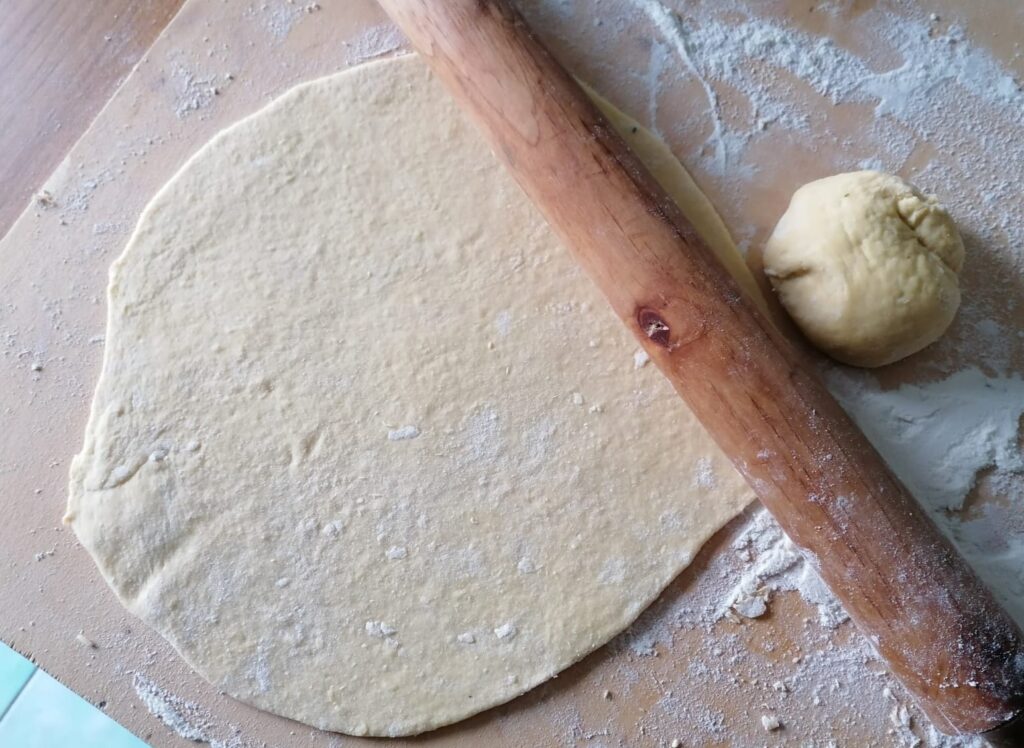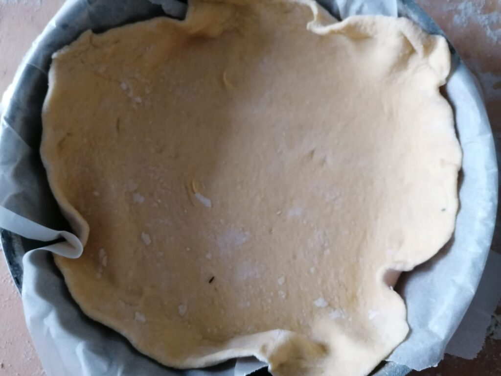 Divide the dough in two parts, one double than the other one. Start to stretch the biggest with the rolling pin, giving a round shape. Place the flattened dough in a round pan lined with baking paper.