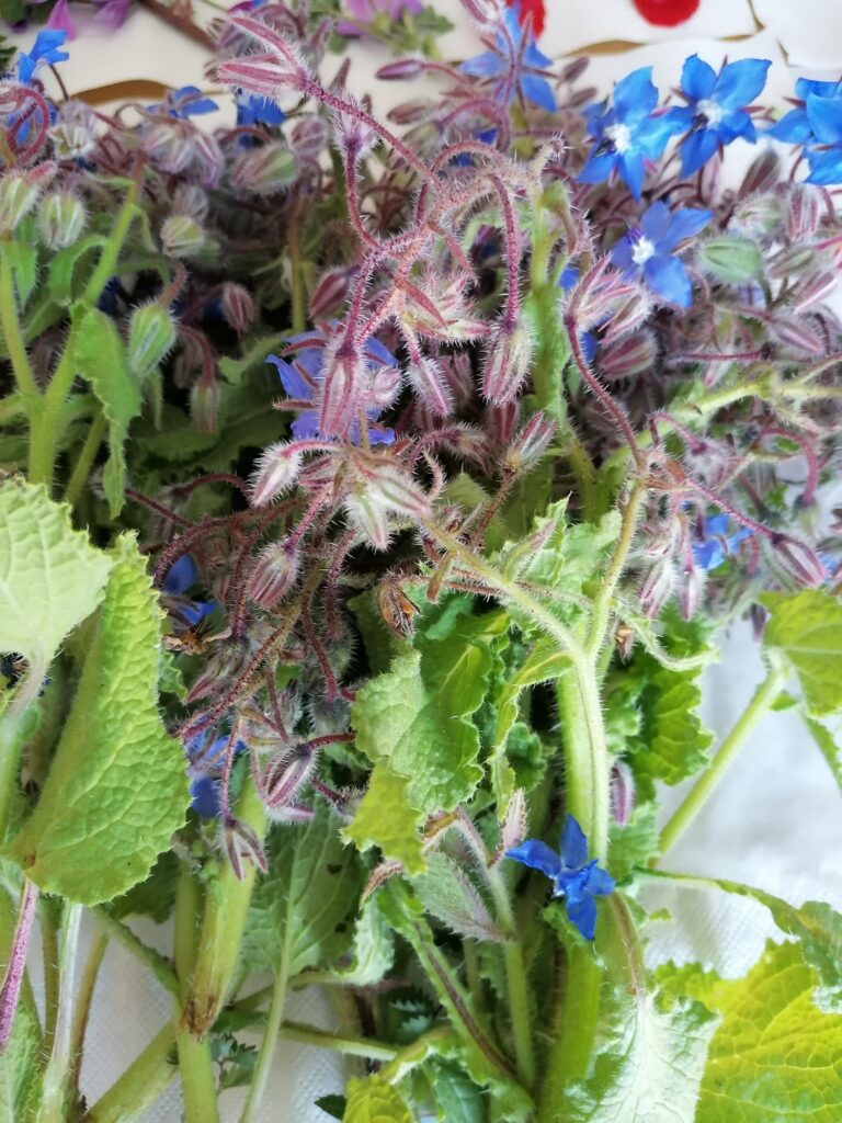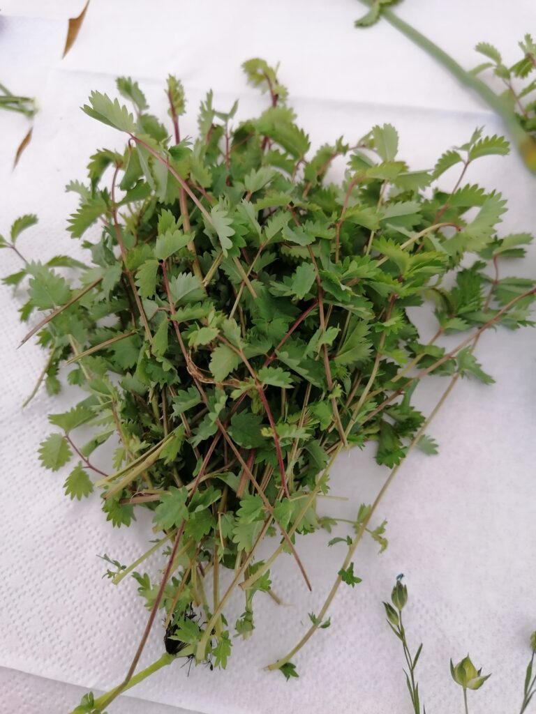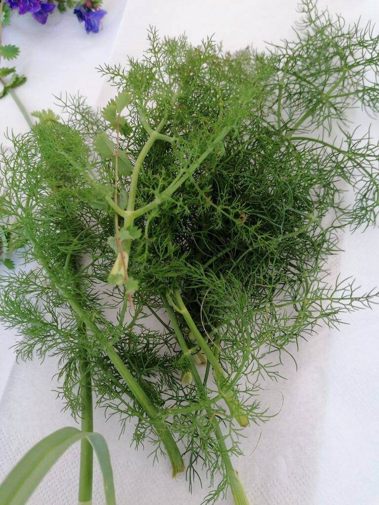 Borage leaves, two sprigs (no more) of wild fennel, about fifteen sprigs of salvastrella, also known as walnut grass.