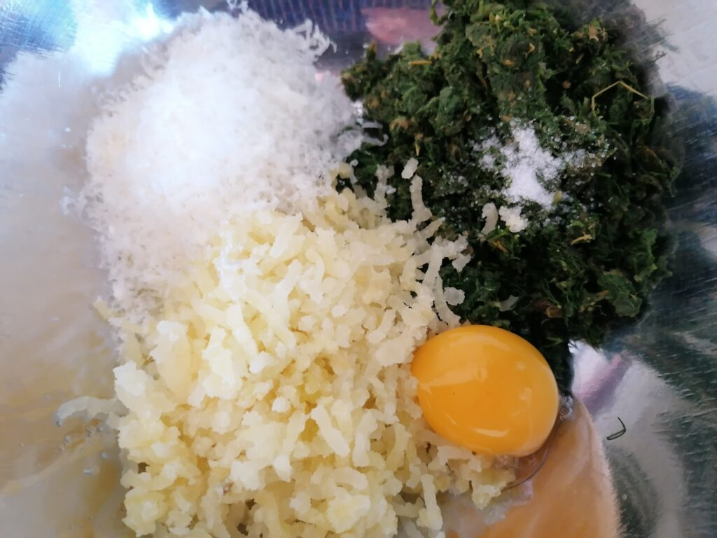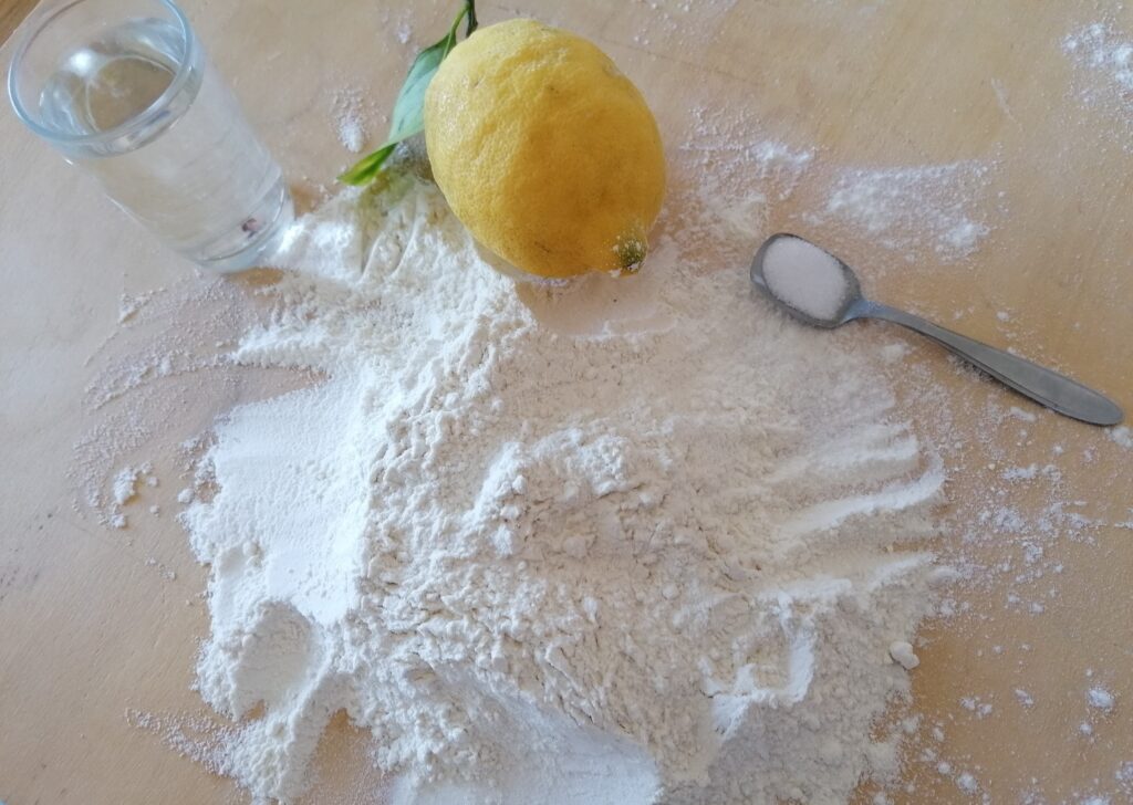 White flour, water, salt, a little grated lemon peel. I make the fountain, water in the center; I first beat with a fork then knead with my hands until the mixture is smooth and elastic. I let him rest. I boil a medium potato in a saucepan.