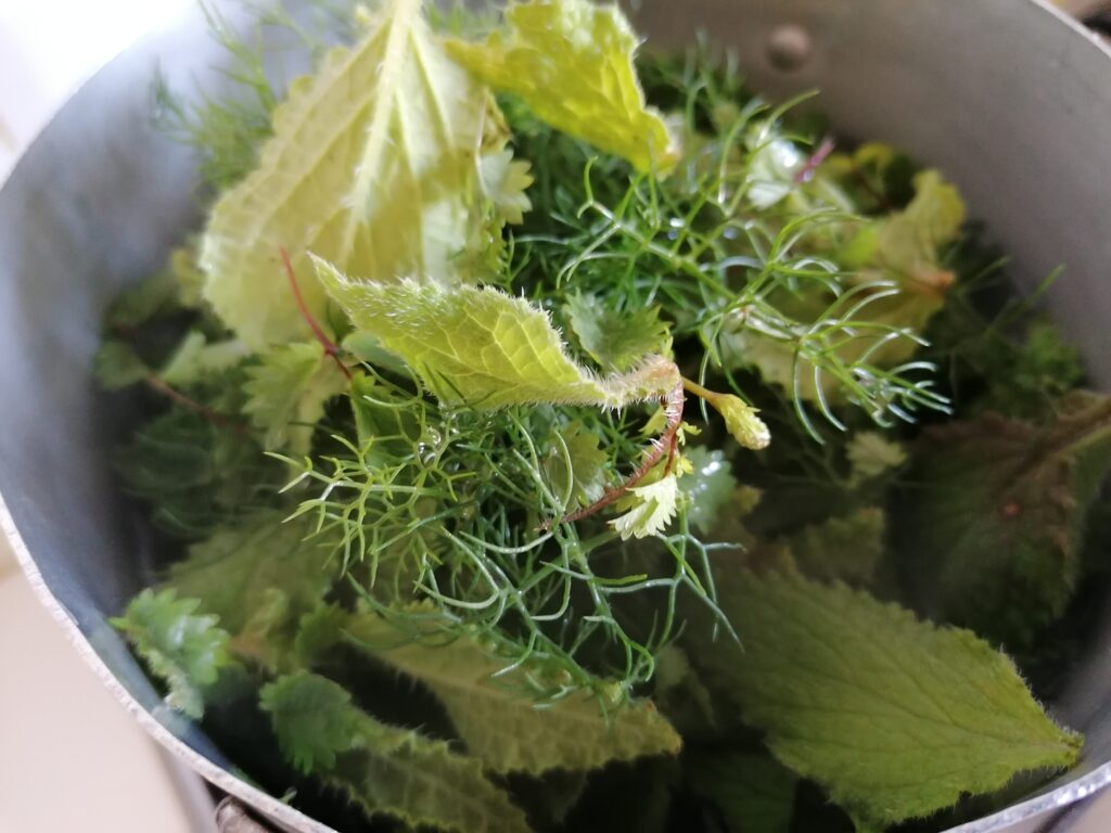 Meanwhile, the water for the herbs is boiling. I put the coarse salt and add the herbs.