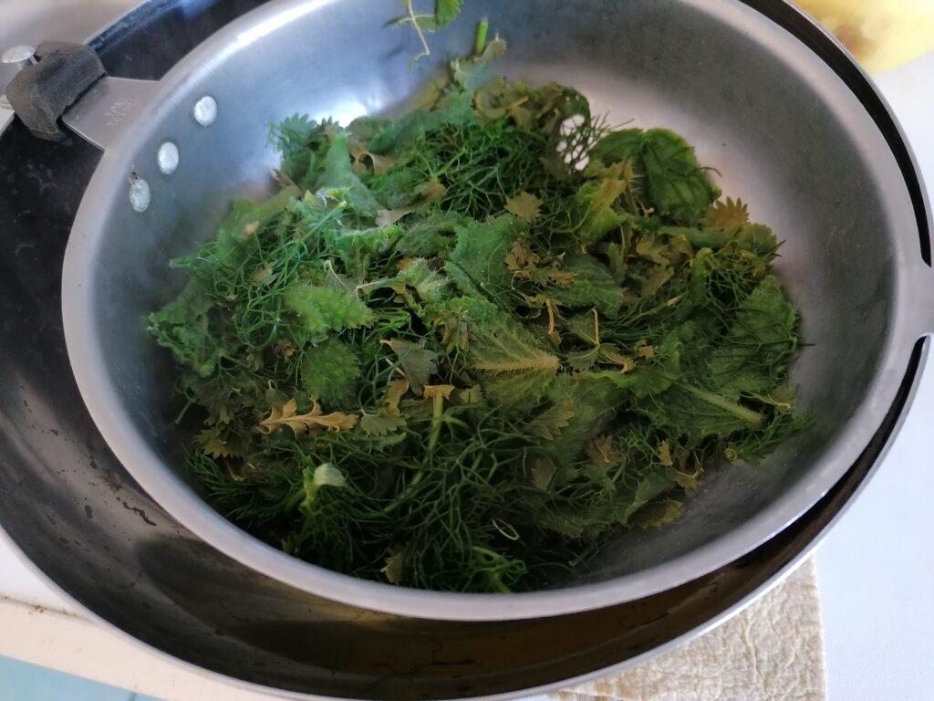 The “greens” cook for 6-7 minutes. Then they are drained, squeezed and chopped,