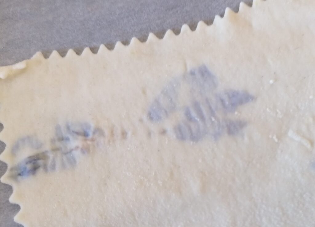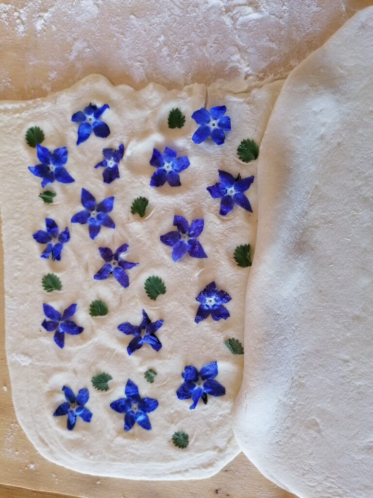 At this point the dough is relaxed and I begin to roll it out with the machine. After the first step, I apply some borage flowers, then I cover with another layer of pasta and I start to roll again with the machine, until the last step, making it very thin.