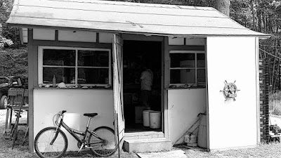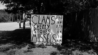 MUSSELS, CHERRIES, STONES, CLAMS written on an panel out-door a small wooden house almost hidden behind pine and maple trees on the way to Bar Harbour.