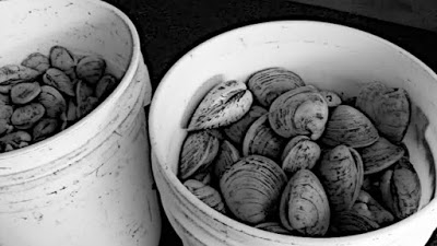 I realized I had been keeping my mouth wide open since the man opened the refrigerator showing me his goods: cherry stones clams divided by size in different buckets. From one inch to 6 inches and more. I bought a few, took a picture of the man with a big cherry stone clam in his hands, paid a little money – compared to the treasure they seemed to my eyes- thanked him for the explanation and went away, back to the rich house where I was welcome, with a kind of amazed bitterness.