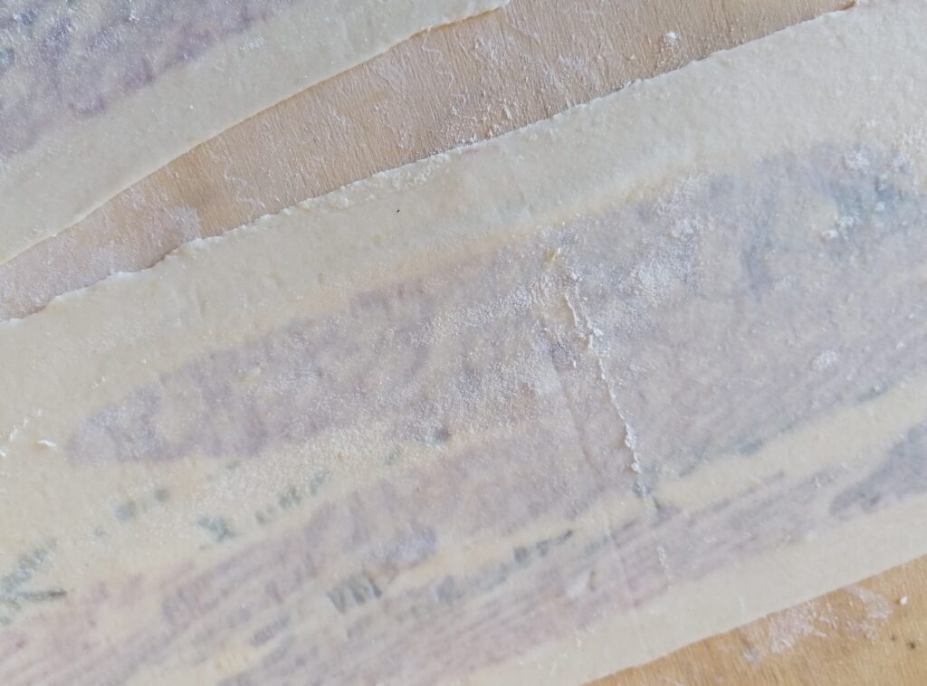 The technique is to insert flowers between two layers of dough and then pass them in the machine to thin it. But the flowers that are spread are also “thinner” and become longer in the paste.
