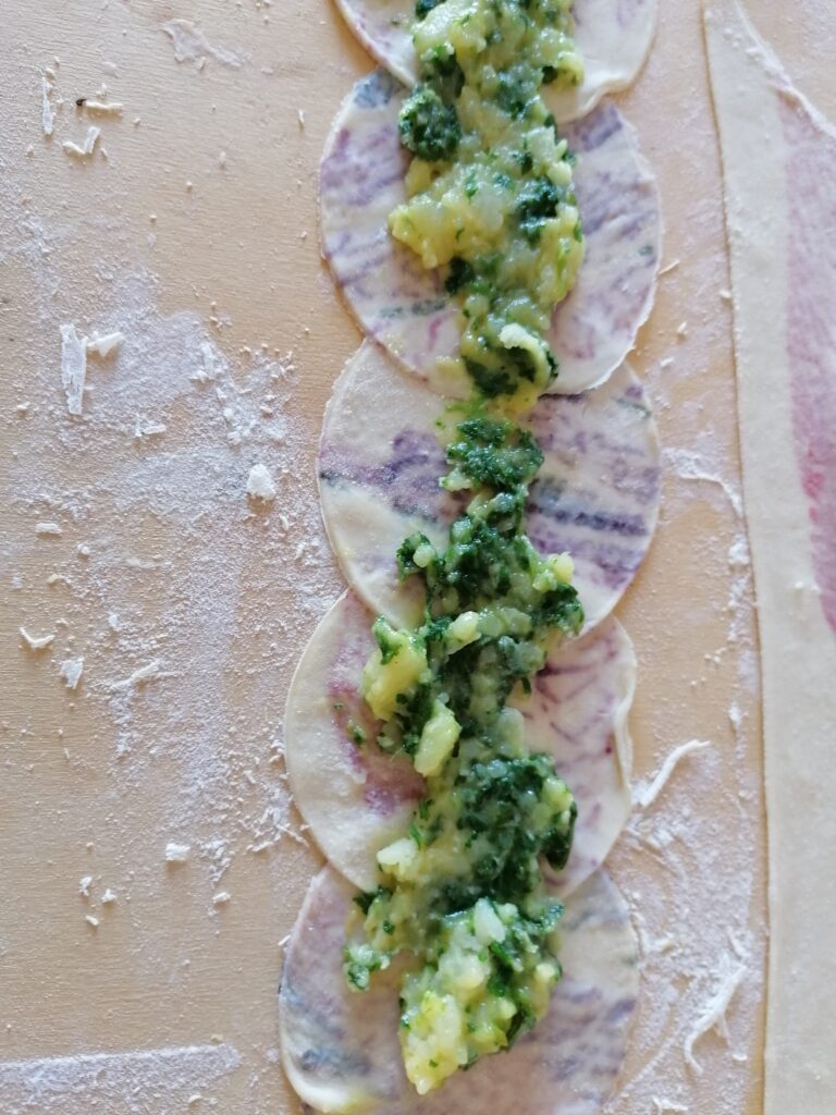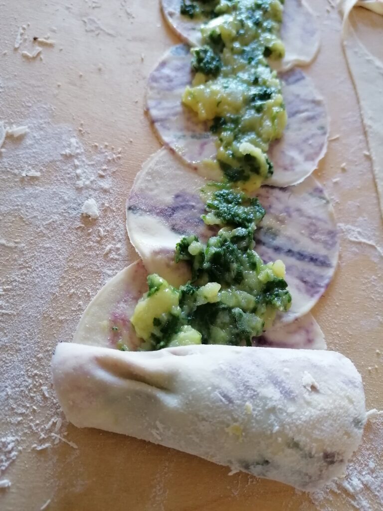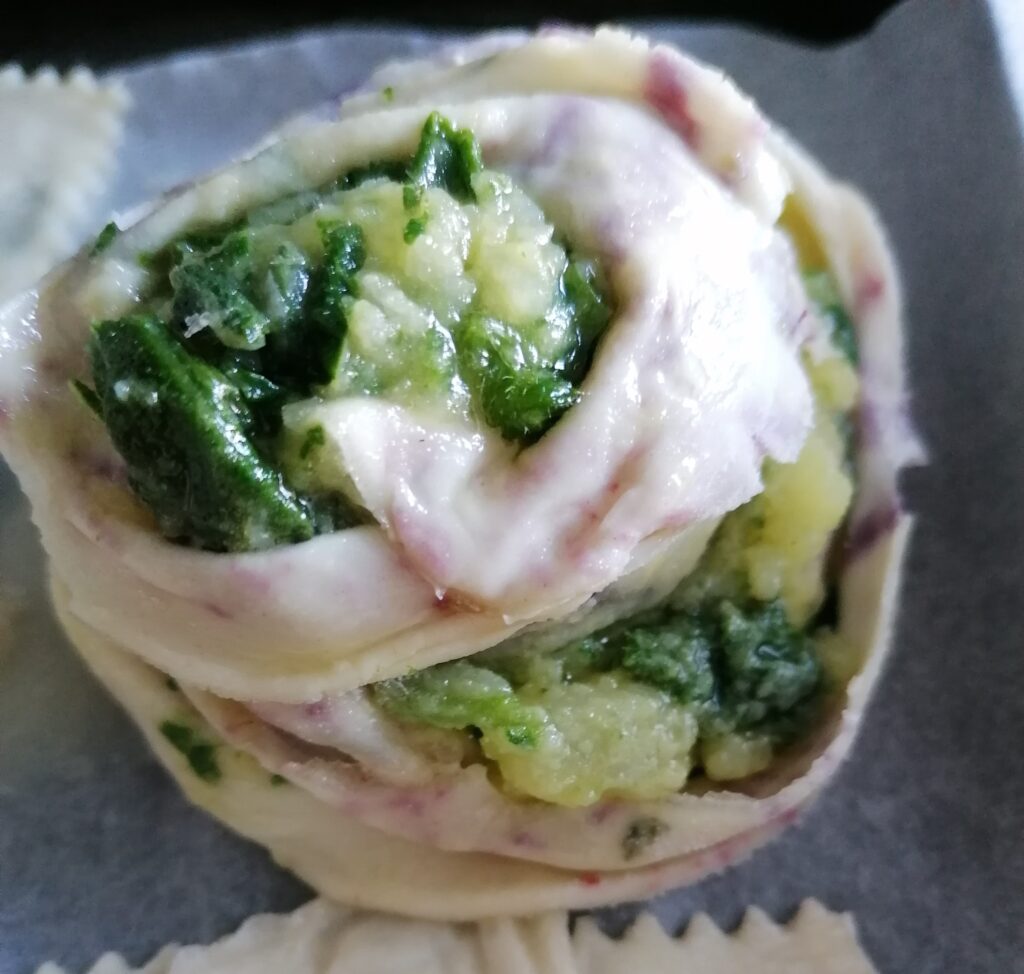 I use poppy leaves and soft leaves of mauve. I boil them in salted water for 5 minutes, drain them, squeeze them and mince them. I make a mixture similar to that of borage ravioli: boiled potato, egg yolk, Parmesan instead of pecorino, salt and pepper.