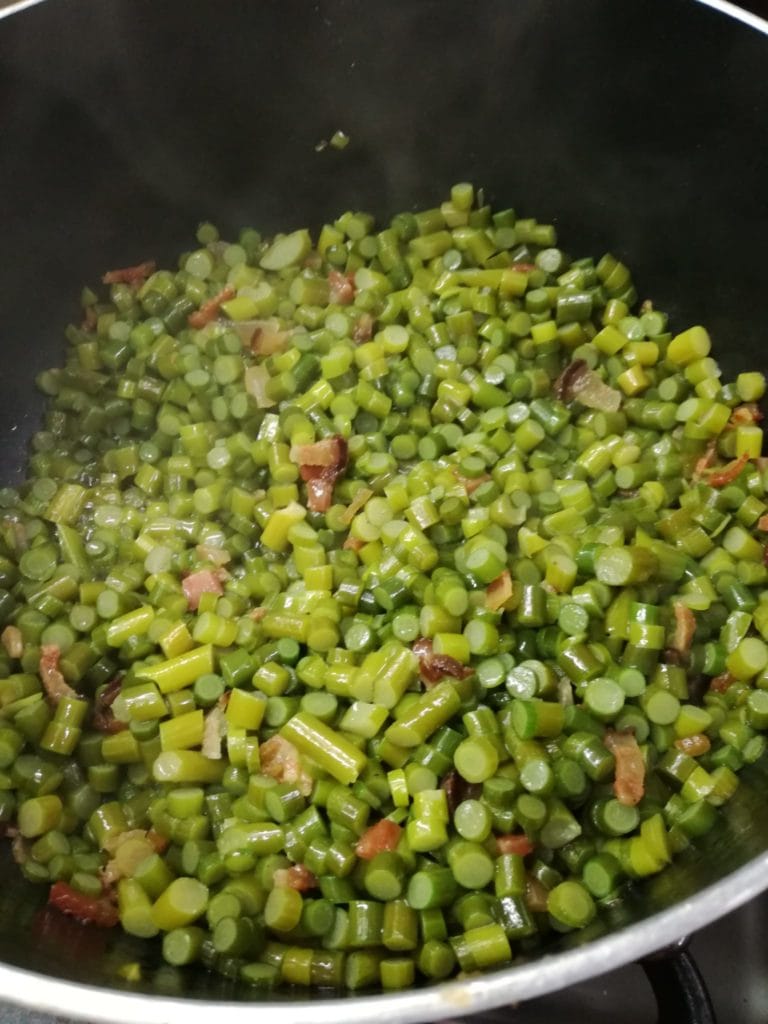 Tagliare il germoglio a fettine sottili e farlo stufare nella stessa padella.
