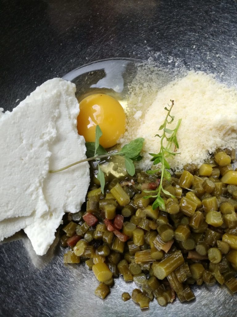 Non ci sono quantità: è una ricetta della tradizione che prevede i porri e che ho rifatto con i germogli di aglione. Devo dire il risultato è stato sorprendente: il sapore non assomiglia all’odore “forte”. È delicato e si sposa benissimo con la ricotta. L’ho provata appena cotta, calda e fragrante.