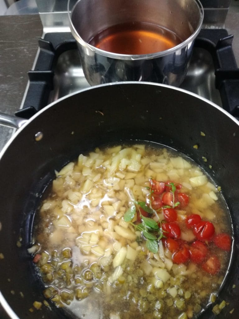 Aggiungete alcuni pomodorini, una manciata di erbe miste come basilico, sedano e maggiorana ben tritate. Oppure timo e una foglia di alloro da togliere alla fine.