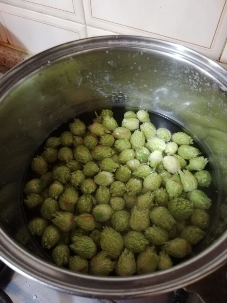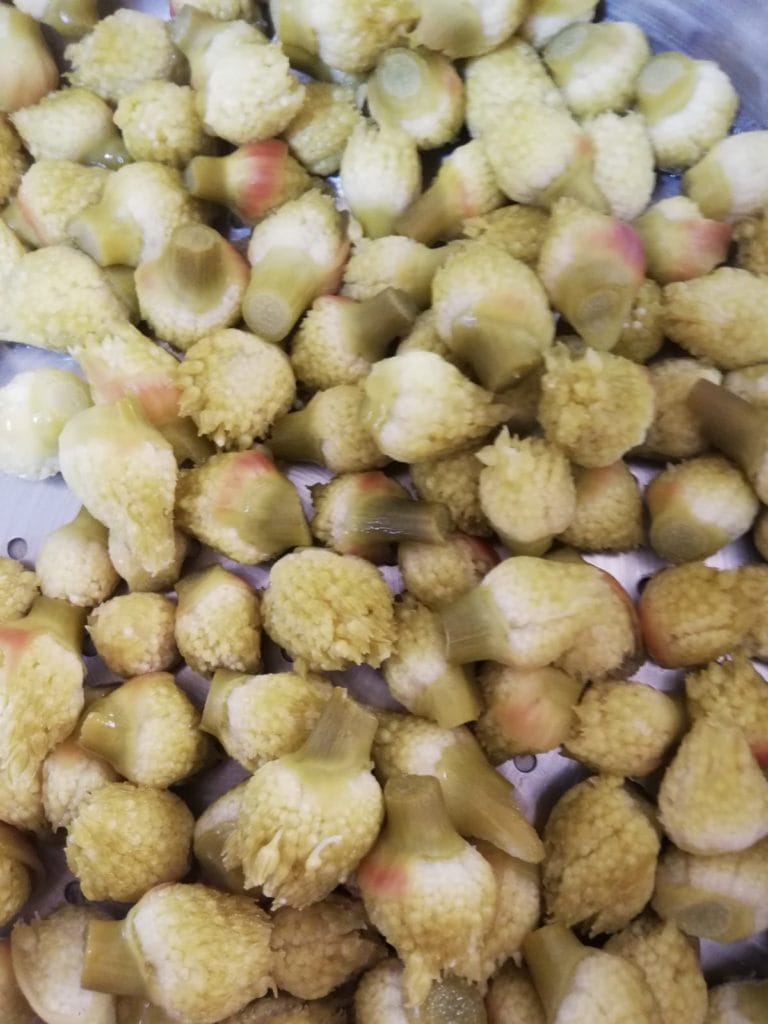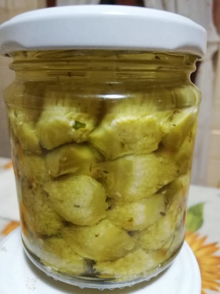 Pellegrino li ha “sgusciati”, li ha scottati in acqua bollente salata e acidulata con qualche cucchiaio di aceto per pochi minuti, scolati ed asciugati. Li ha messi poi nei vasetti con un trito delle erbe aromatiche, un po’ coltivate nel suo campo e un po’ proveniente dall’azienda Sapori Della Toscana: salvia e rosmarino finemente tritati, origano, peperoncino.