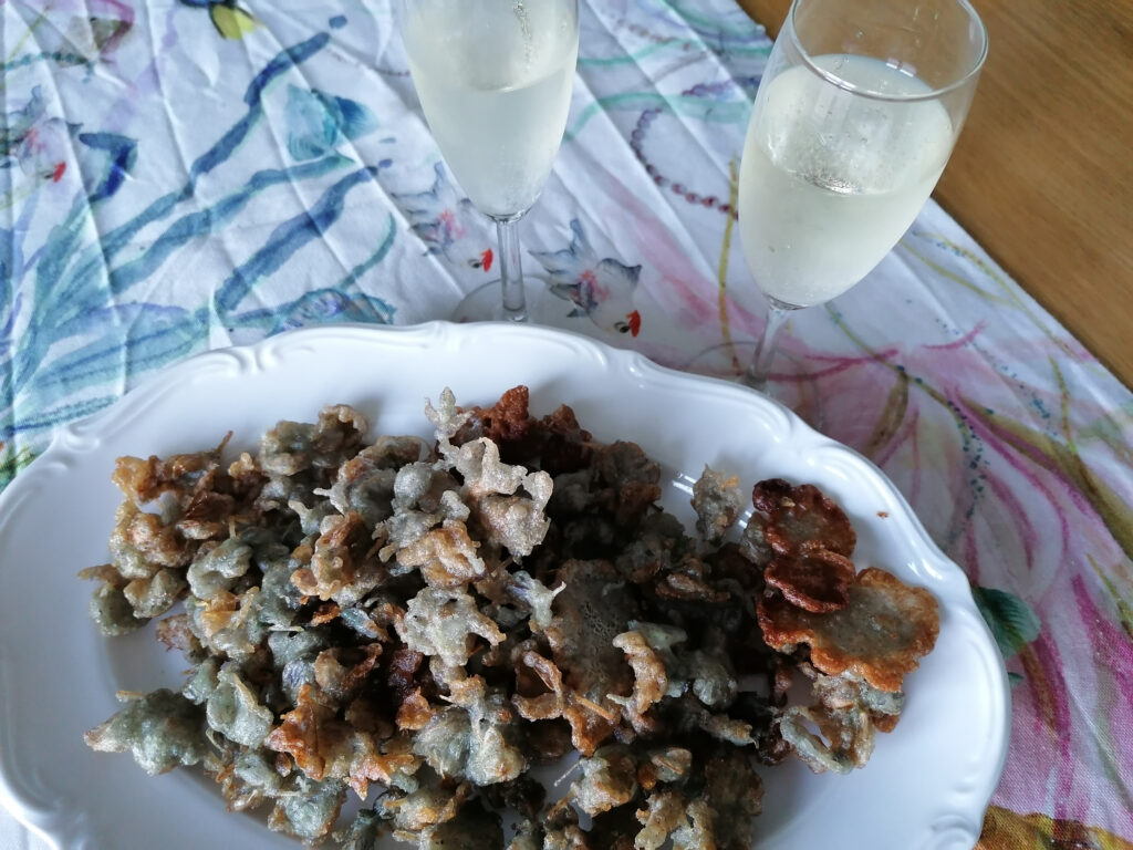 Coming back home I decided to fry the flowers and serve them with a goblet of Prosecco as aperitif.