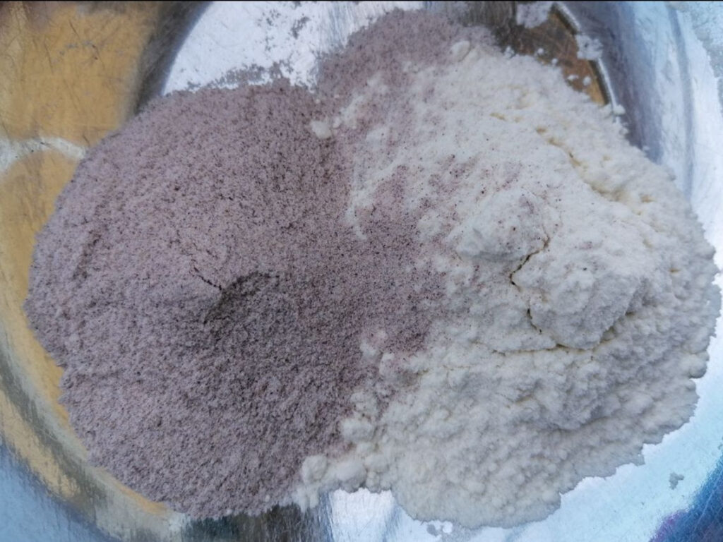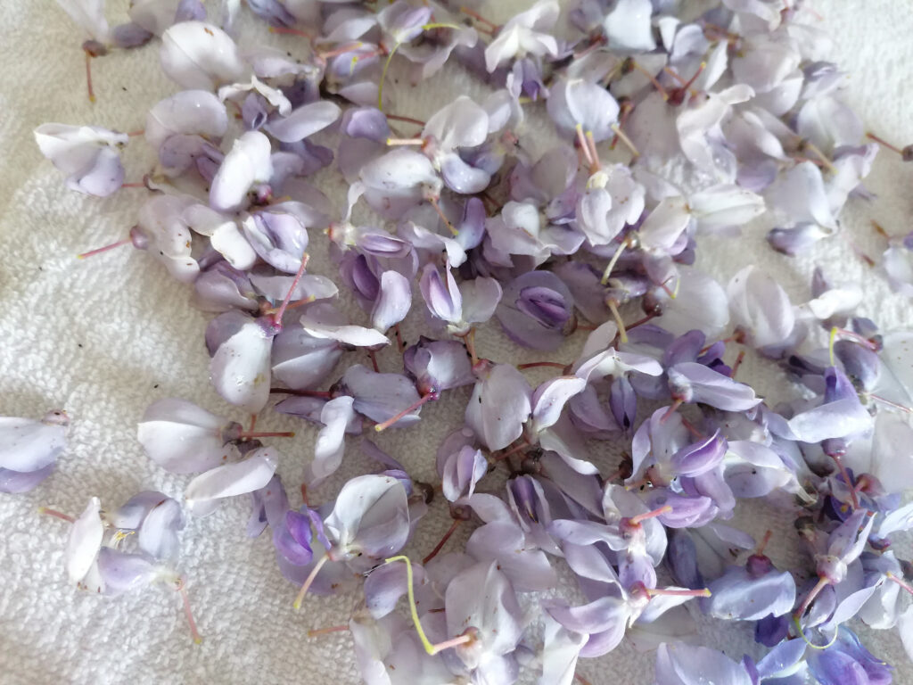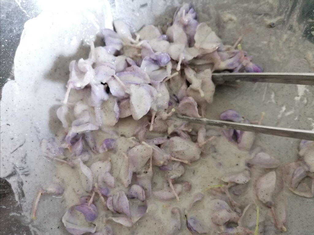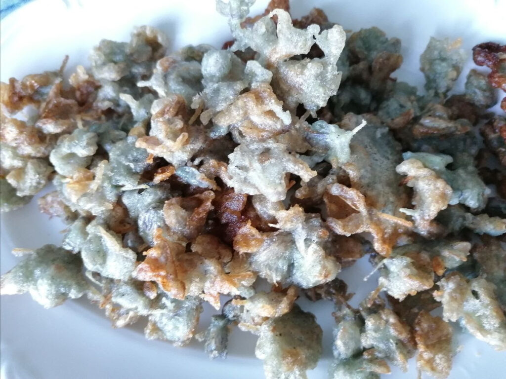 After having delicately washed the “grapes” of flowers, I have separated them one by one and placed on a cloth to dry. I have made a batter with 50 gr (3 tbs) of flour 00, 50 gr of blue corn flour, 100 ml water (less than 1/2 cup), 1/2 teaspoon of baking powder. I have put the flowers in the bowl and mixed gently. I have fried them separated one by one.
