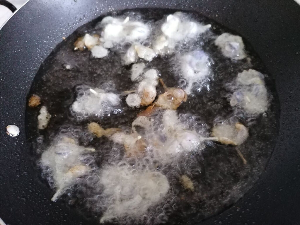 I have used peanut oil and brought it to 175° c – 347 F. I have deep fried them until crispy (about 2 minutes) and placed on absorbing paper.
