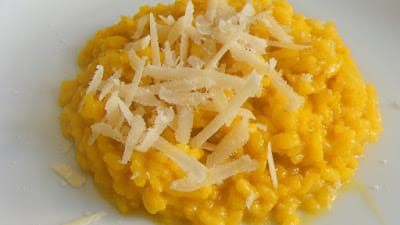 The yellow Risotto you see above is the Risotto with Saffron Alla Milanese. The beginning fats are butter and beef marrow with fresh onions, the deglazing is made with dry white wine, the braising with beef broth, the Mantecatura with butter and Parmigiano Reggiano. It is considered the father (or the mother) of all the Risottos, the first that dictated the rules.