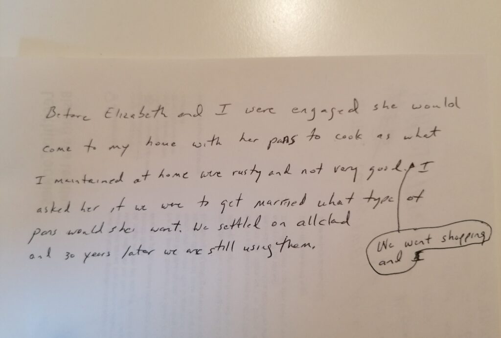 - Before Elizabeth and I were engaged, she would come to my home with her pans to cook, as what I maintained at home were rusty and not very good. We went shopping and I asked her, if we were get married, what type of pans would she want. We settled on a…d and 30 years later we are still using them